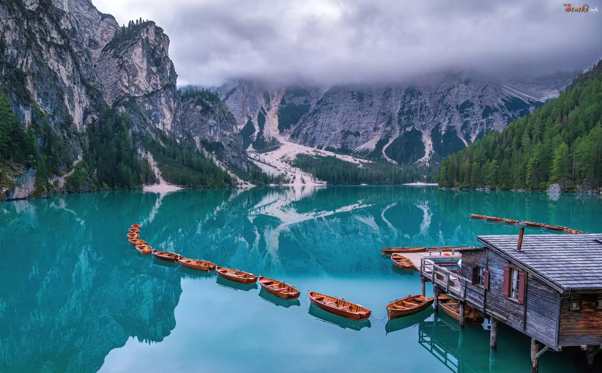 Włochy, Południowy Tyrol, Jezioro, Lago di Braies, Pragser Wildsee, Góry, Dolomity, Pomost, Łódki, Drewniany, Dom |