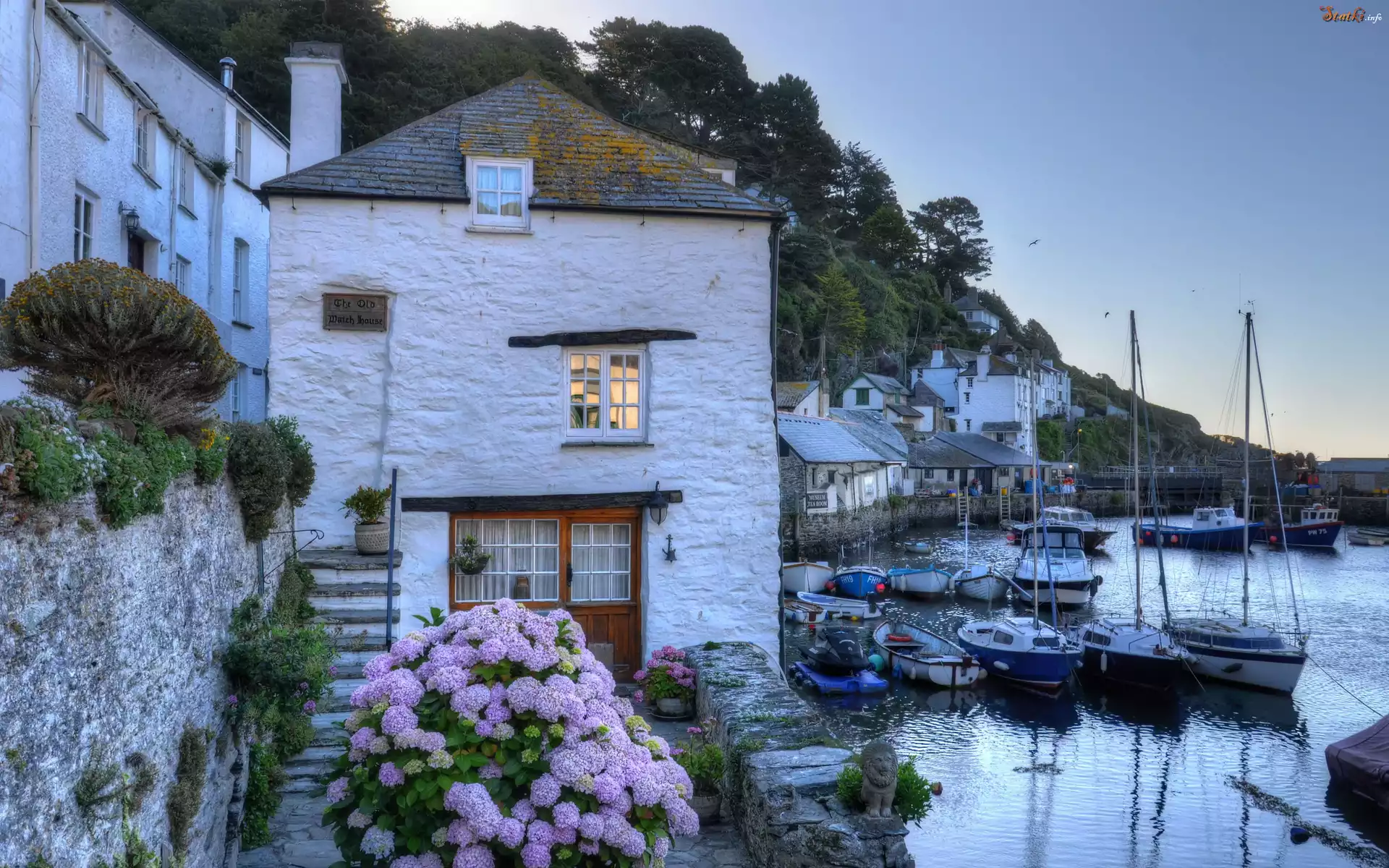 Statek Domy, Przystań, Łódki, Hortensja, Drzewa, Polperro, Anglia