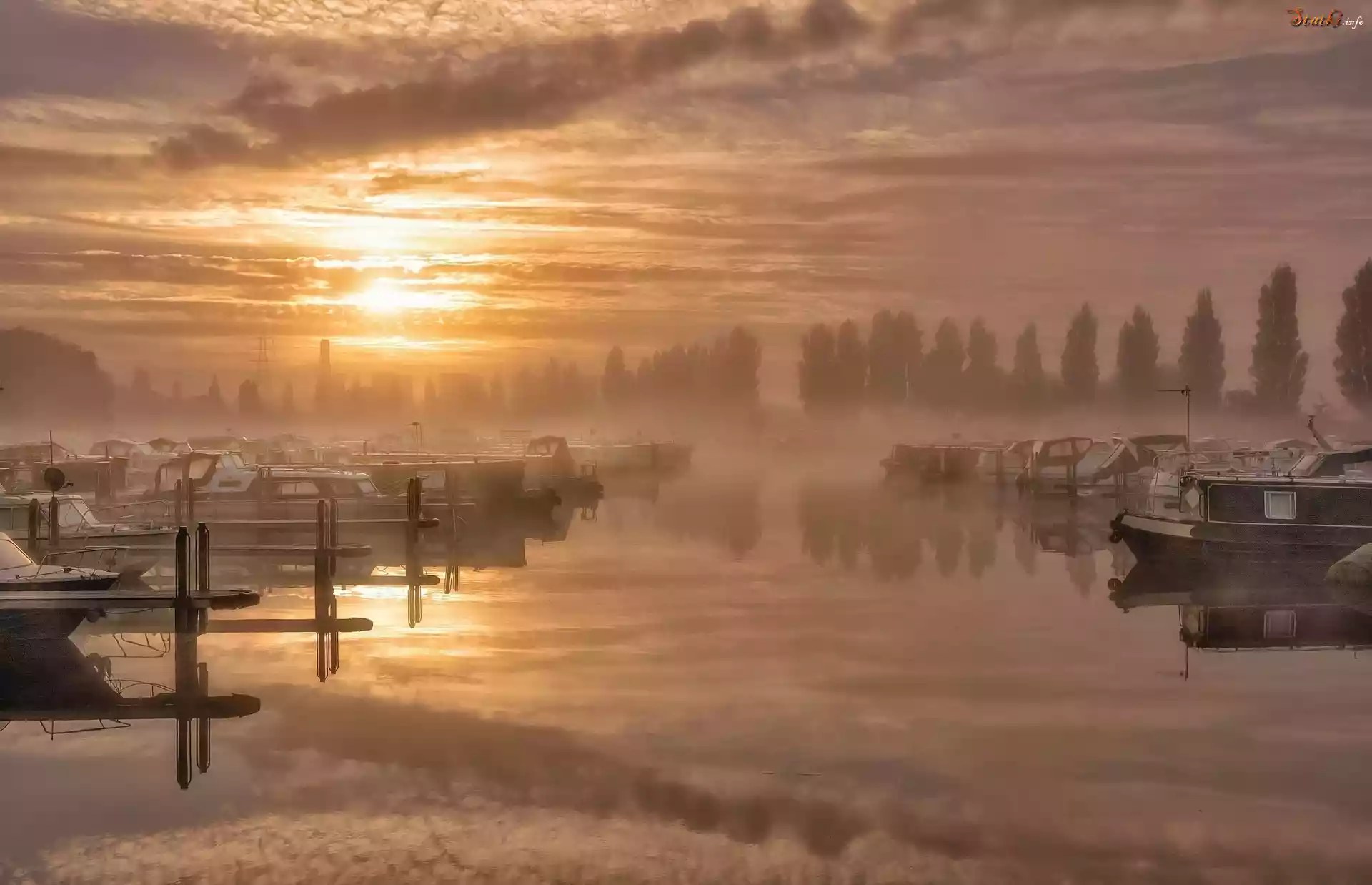 Statek Przystań, Wschód słońca, Motorówki, Drzewa, Mgła