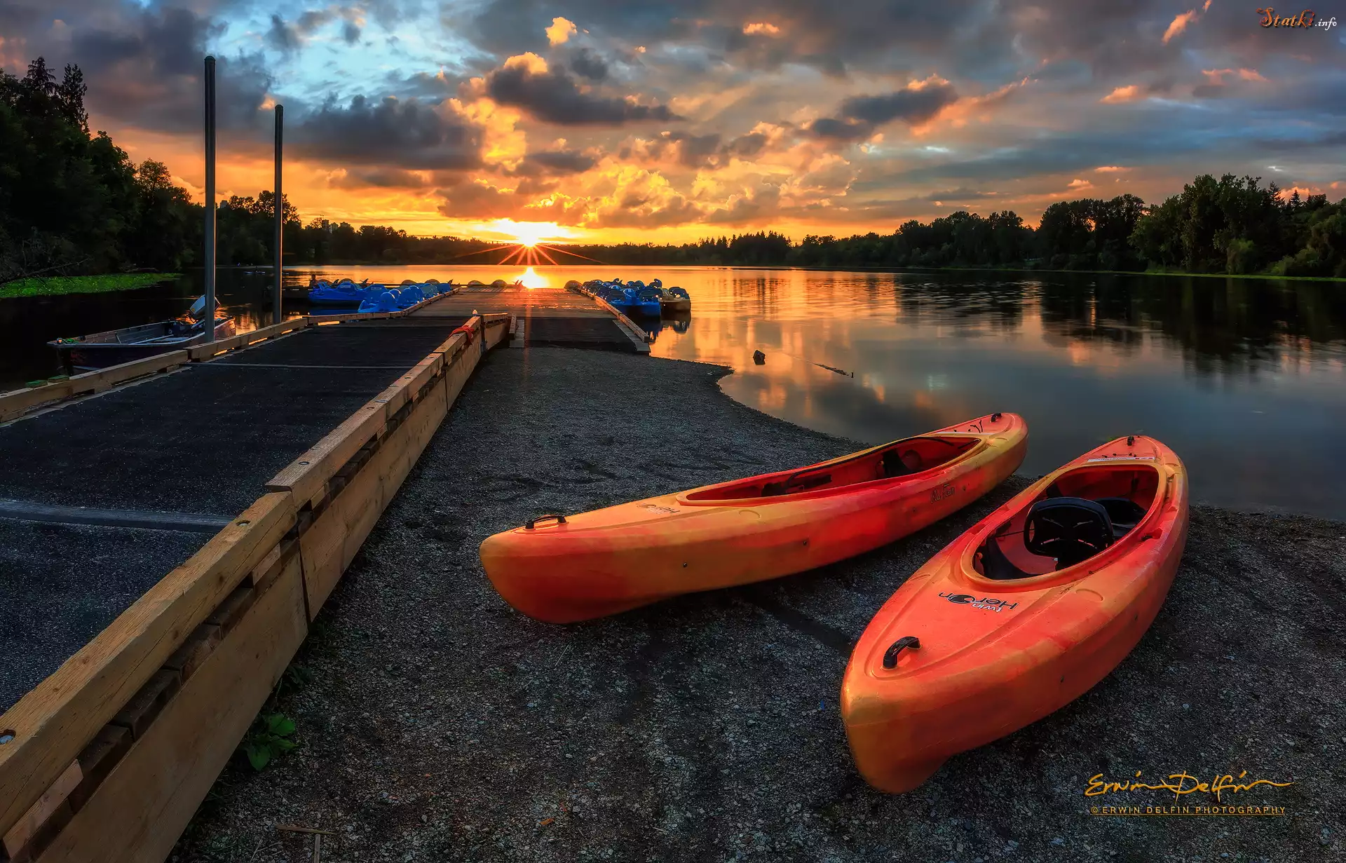 Zachód słońca, Przystań, Kajaki, Jezioro Deer, Deer Lake Park, Burnaby, Kanada
