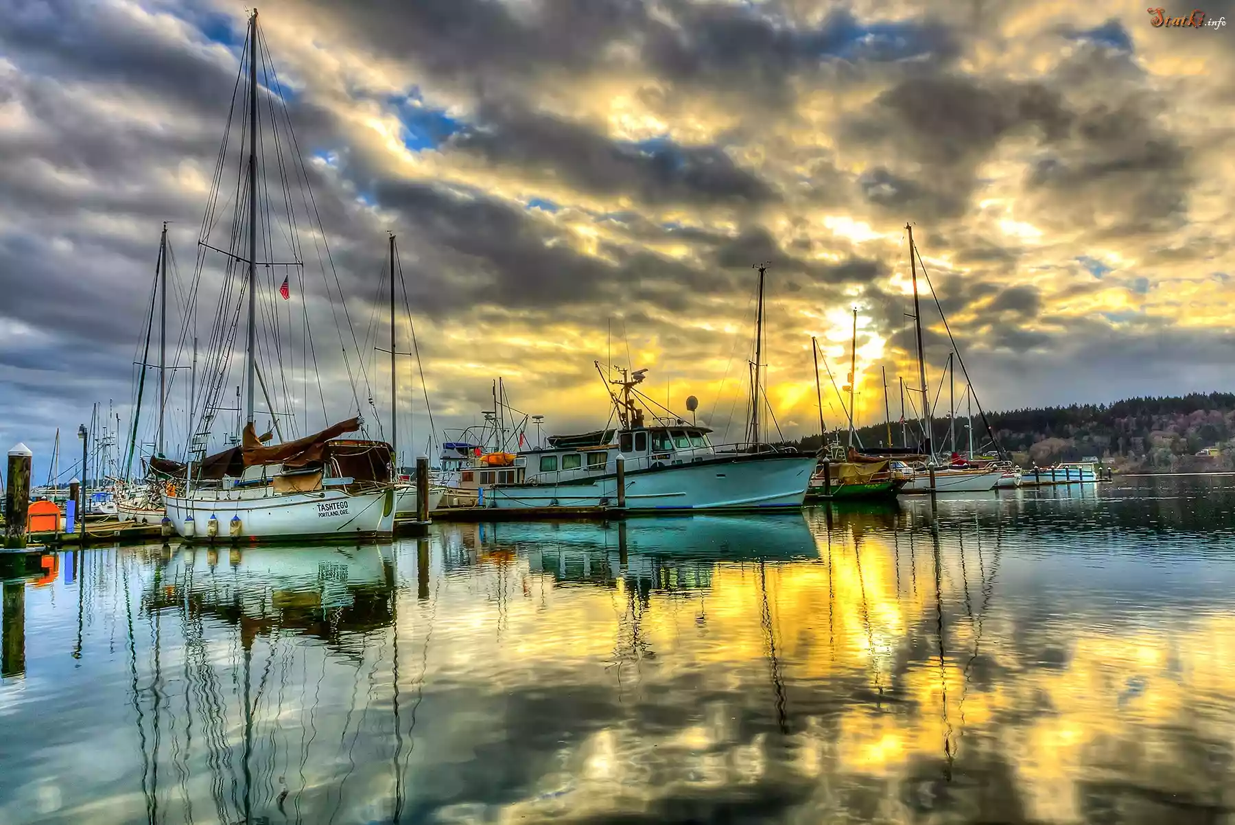 Statek Przystań, Motorówki, Jachty, Niebo, Chmury