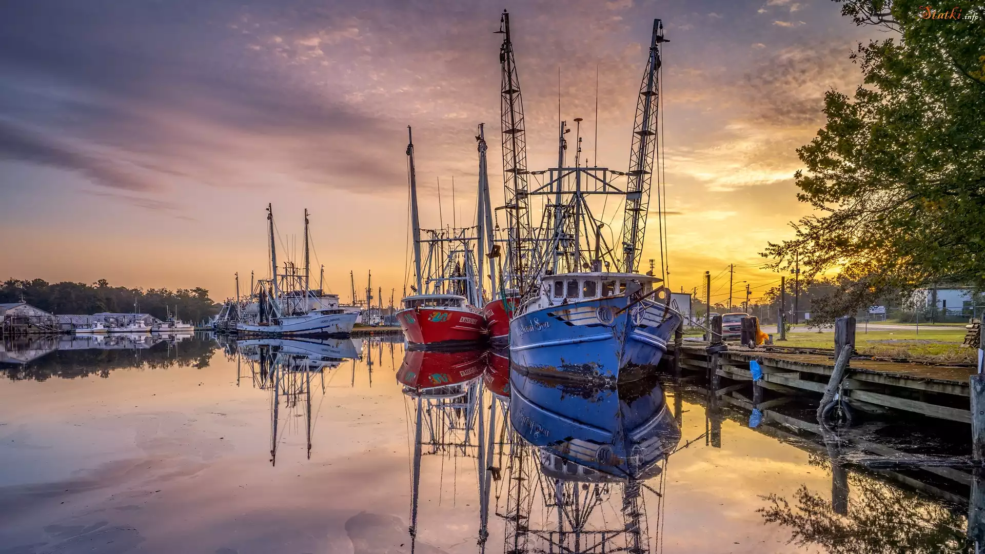 Statek Przystań, Kutry, Statki rybackie, Drzewa, Wschód słońca, Chmury