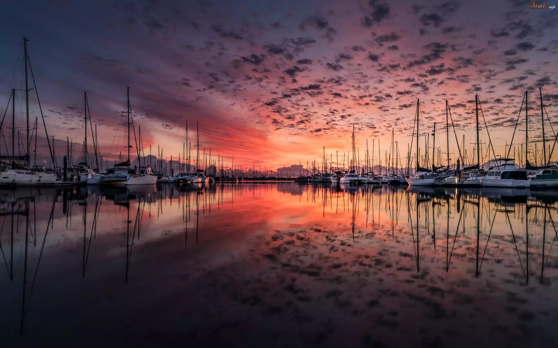 Statek Przystań, Jachty, Jezioro, Zachód słońca