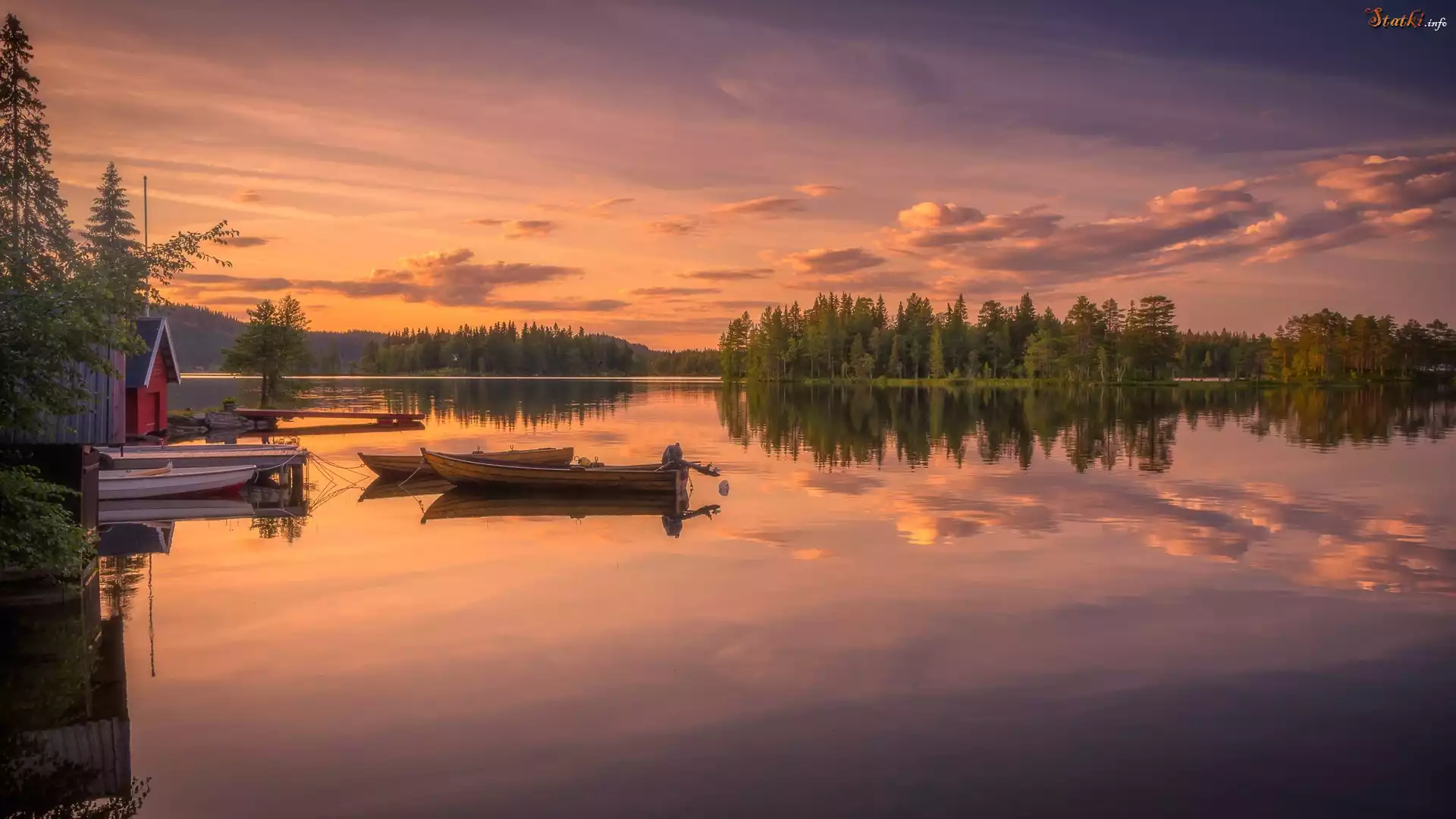 Statek Norwegia, Ringerike, Jezioro, Las, Łódki, Zachód słońca