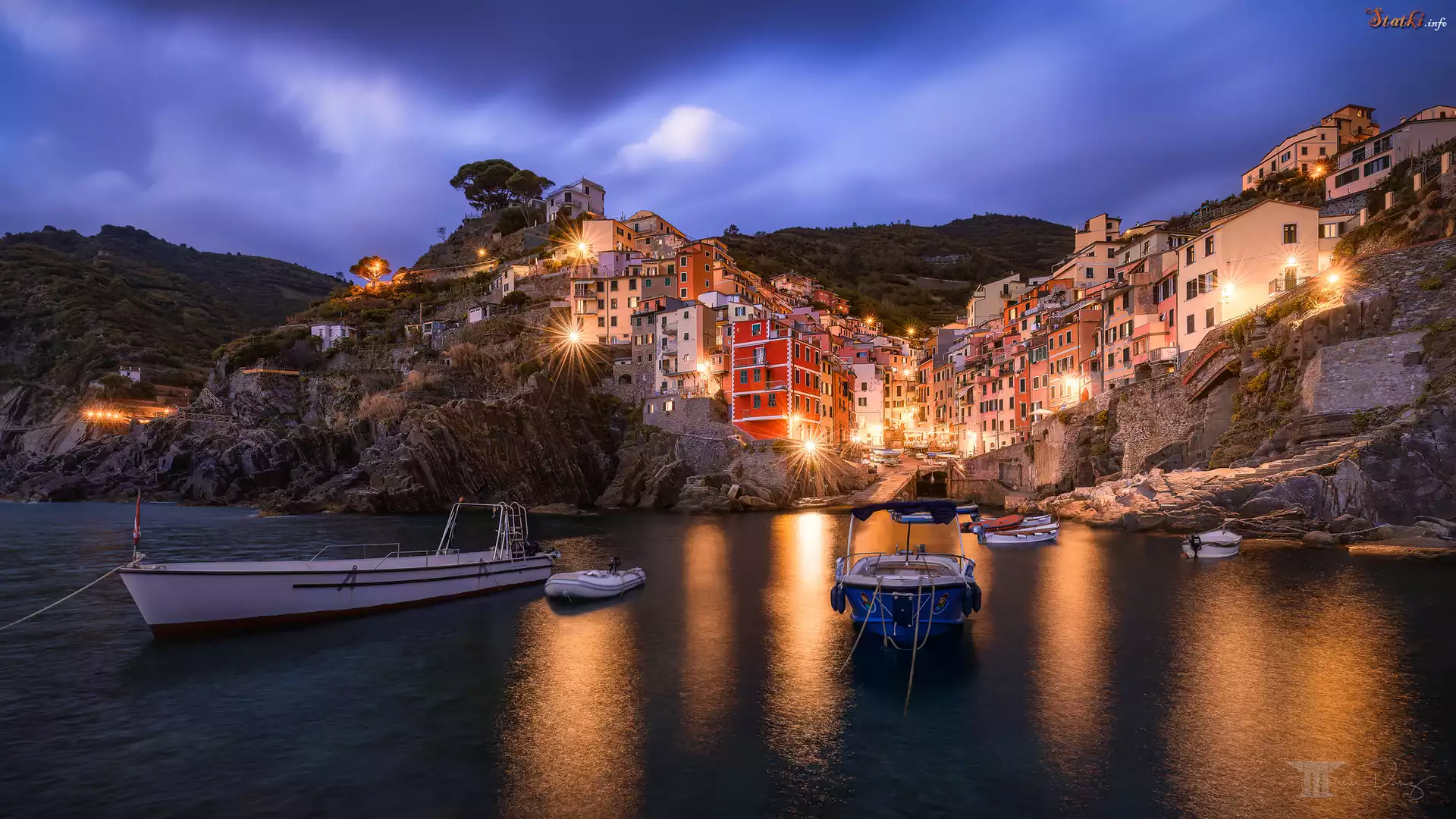 Statek Riomaggiore, Cinque Terre, Włochy, Łódki, Domy, Góry, Światła, Zmrok