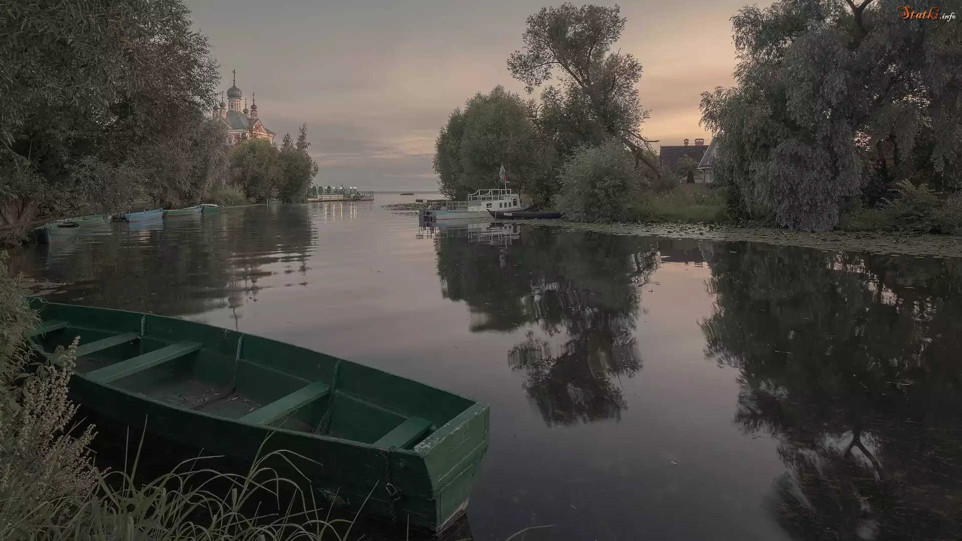 Statek Rzeka Trubezh, Łódka, Drzewa, Chmury, Peresław Zaleski, Obwód jarosławski, Rosja