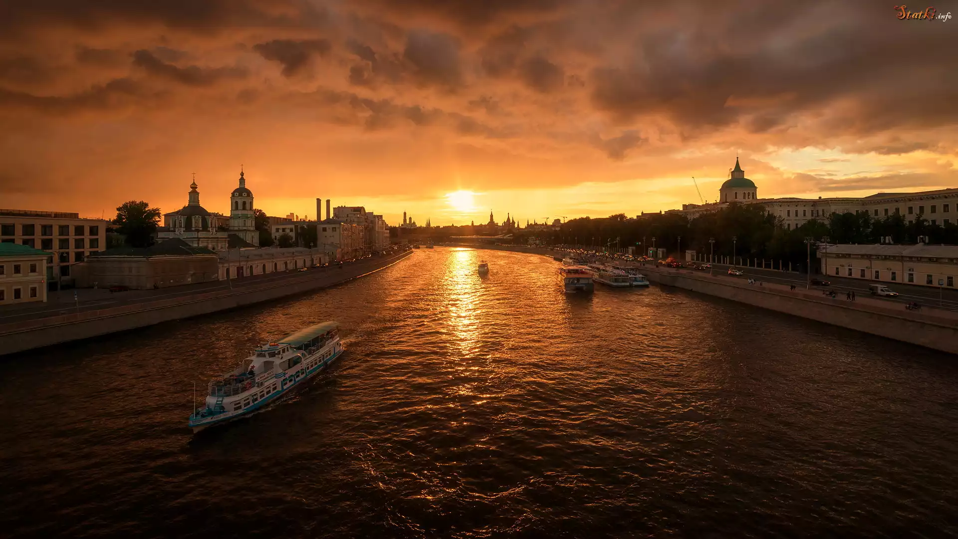 Rzeka Moskwa, Statki, Cerkwie, Domy, Zachód słońca, Moskwa, Rosja