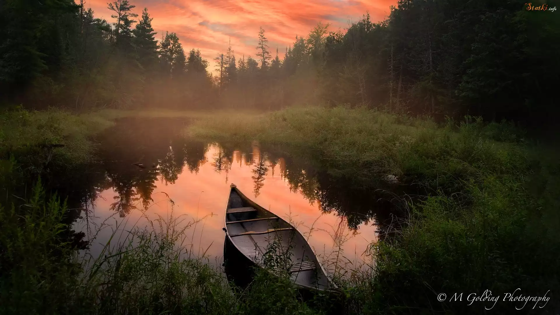 Staw, Czerwone, Niebo, Mgła, Łódka, Las, Drzewa, Rośliny