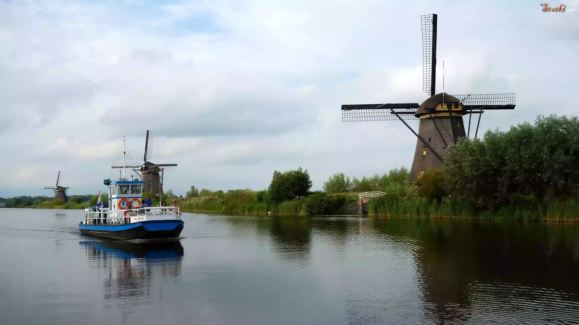 Statek Rzeka, Statek, Wiatraki, Wieś Kinderdijk, Holandia