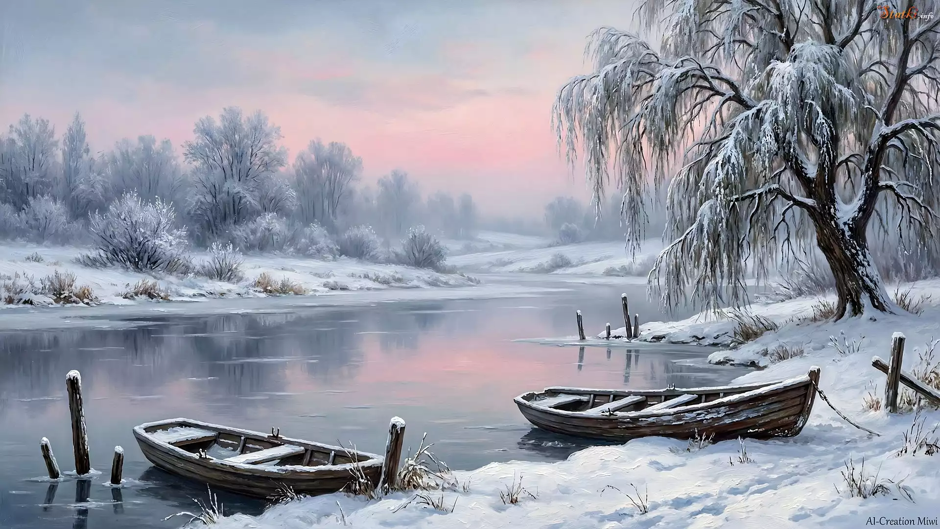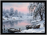 Zima, Dwie, Łódki, Rzeka, Drzewa, Grafika AI