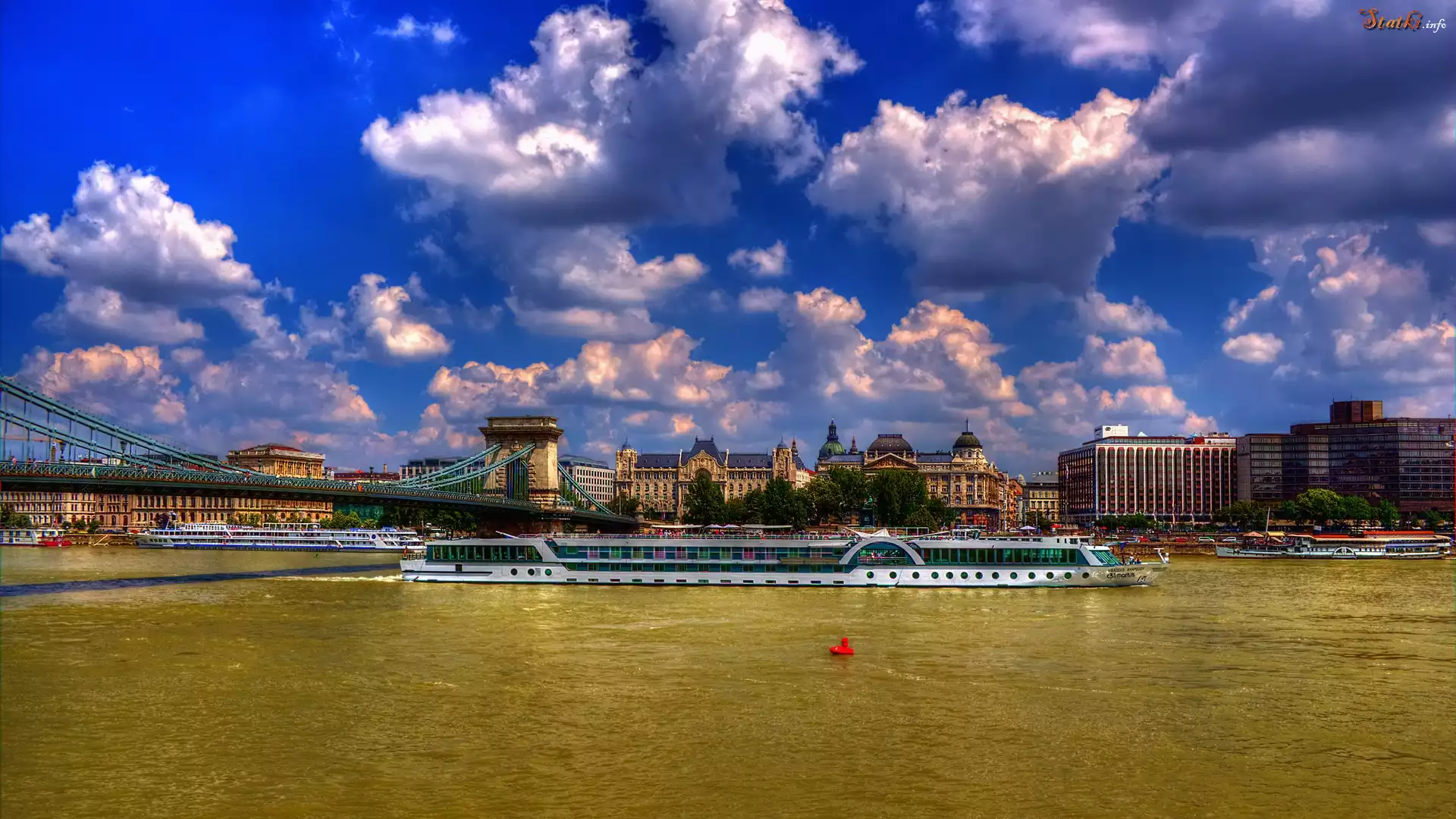 Statek Rzeka, Most, Statek, Chmury, Panorama, Miasta