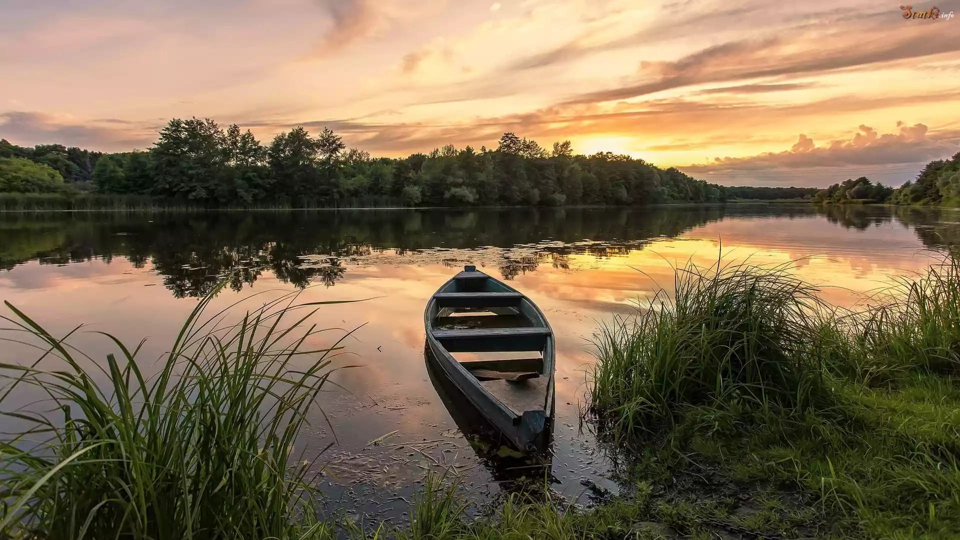 Rzeka, Łódka, Zachód słońca, Trawa, Drzewa