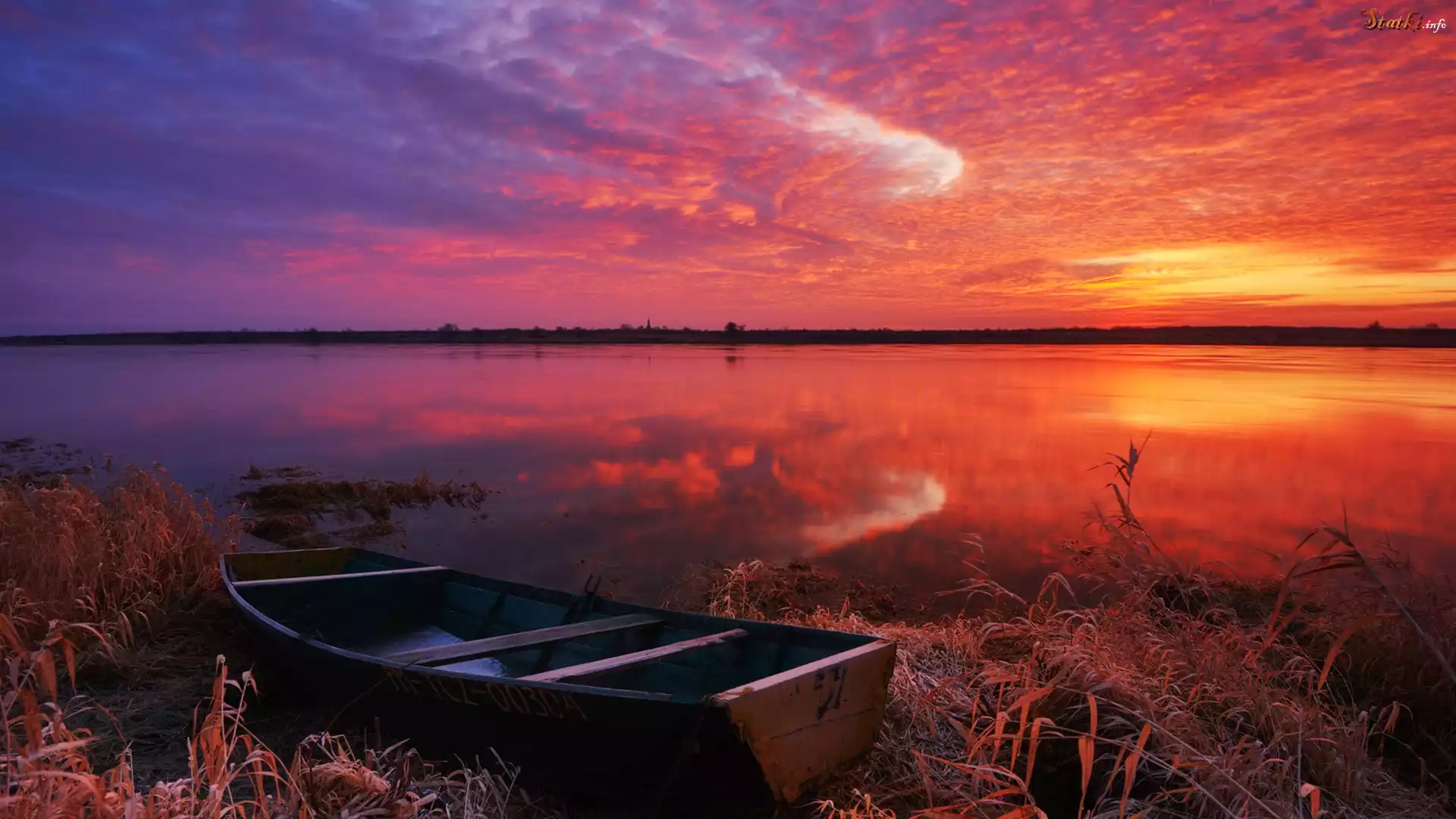 Statek Rzeka, Łódka, Szuwary, Zachód słońca