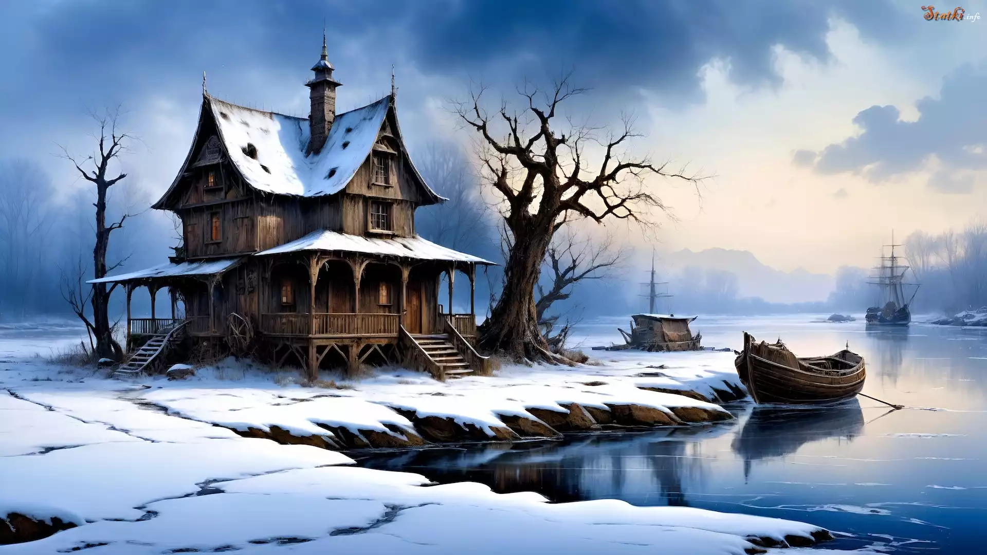 Statek Grafika, Dom, Drzewa, Rzeka, Łódka, Zima