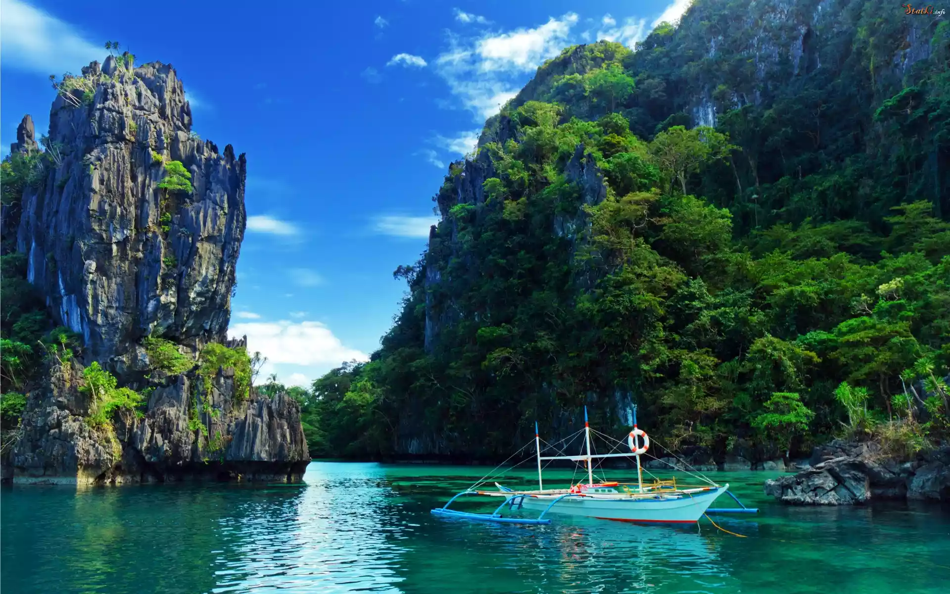 Statek Łódz, Jezioro, Skały, Drzewa