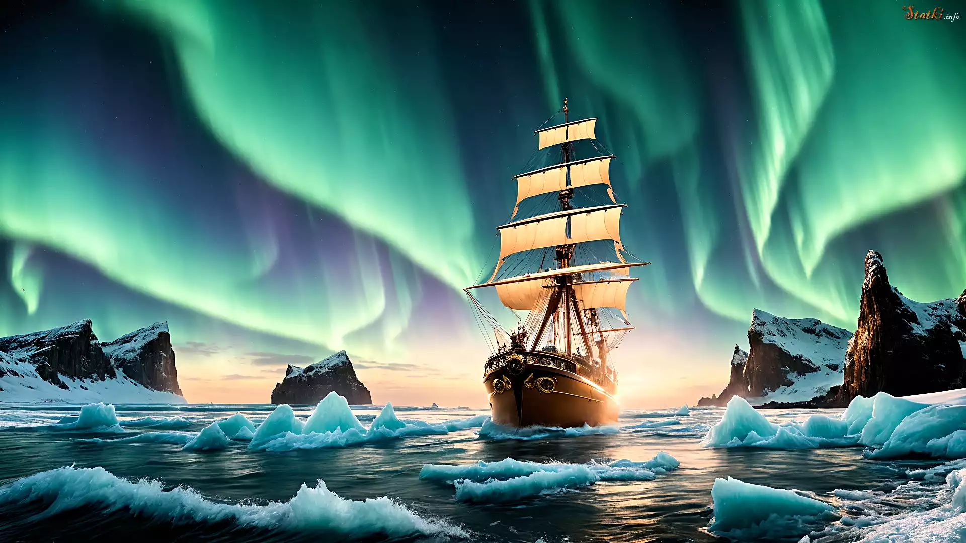Statek Grafika, Morze, Kry lodowe, Zorza polarna, Żaglowiec, Skały