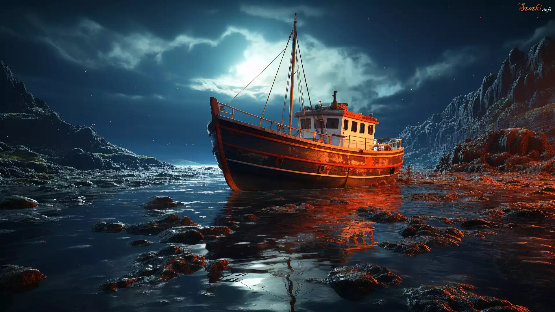 Statek Noc, Morze, Góry, Skały, Statek, Kuter