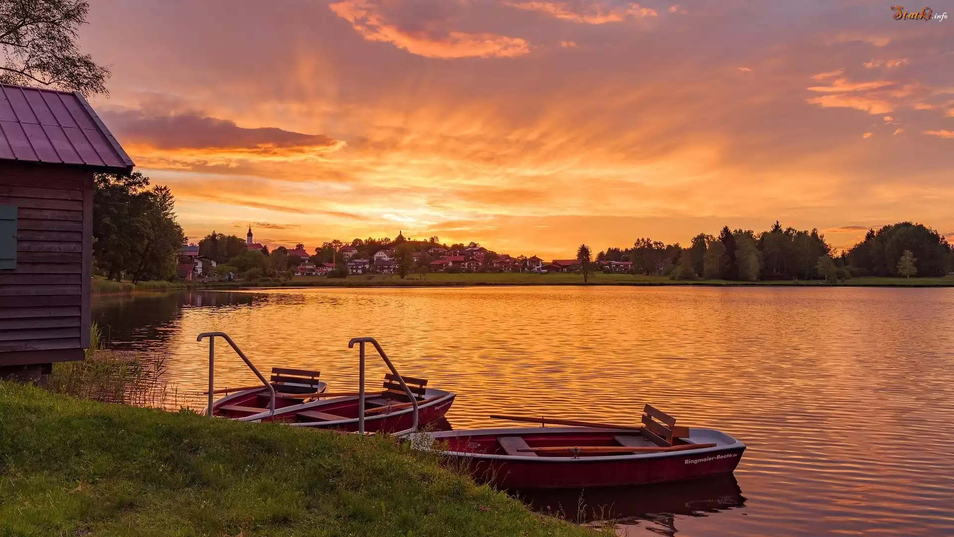 Zachód słońca, Jezioro, Łódki, Domy