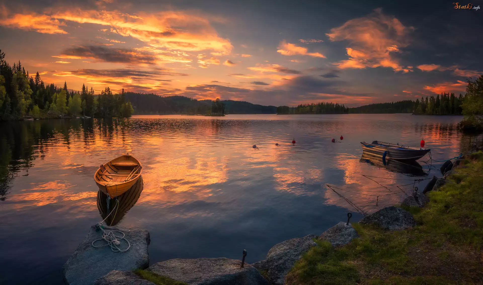 Statek Norwegia, Ringerike, Jezioro, Łódki, Brzeg, Drzewa, Chmury, Zachód słońca
