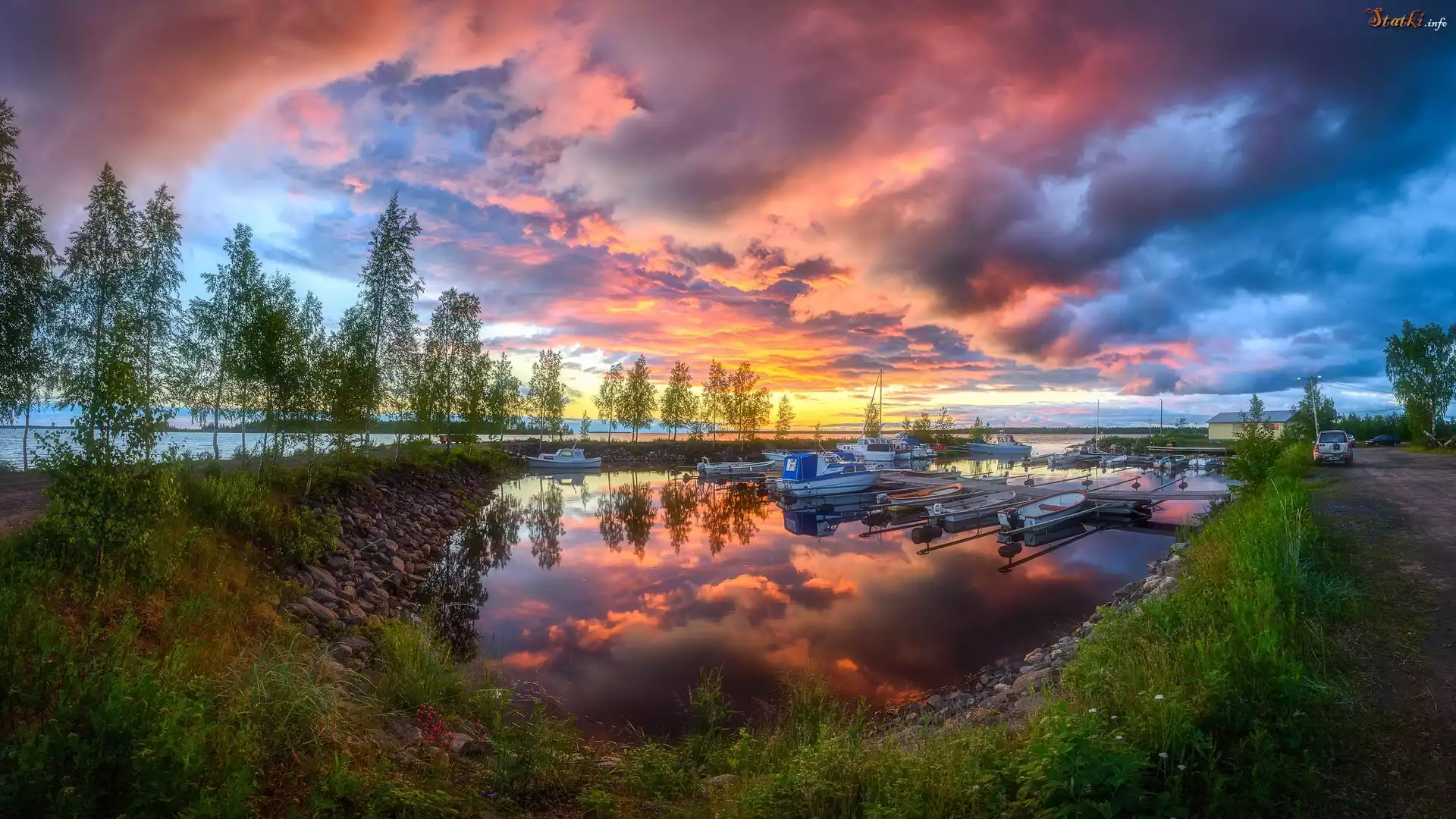 Zachód słońca, Chmury, Przystań, Motorówki, Droga, Drzewa, Jezioro