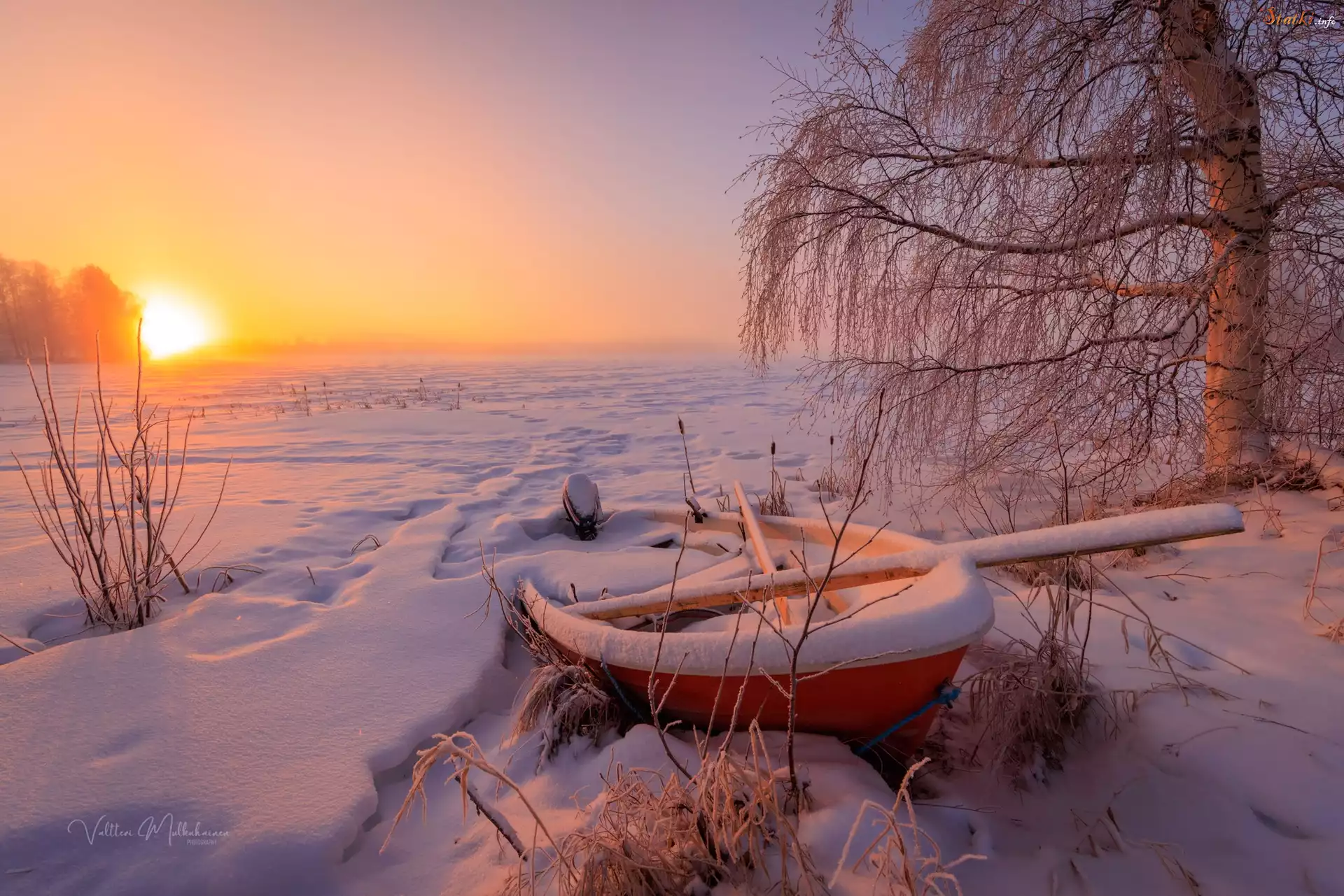 Statek Zima, Śnieg, Łódka, Drzewo, Brzoza, Rośliny, Zachód słońca