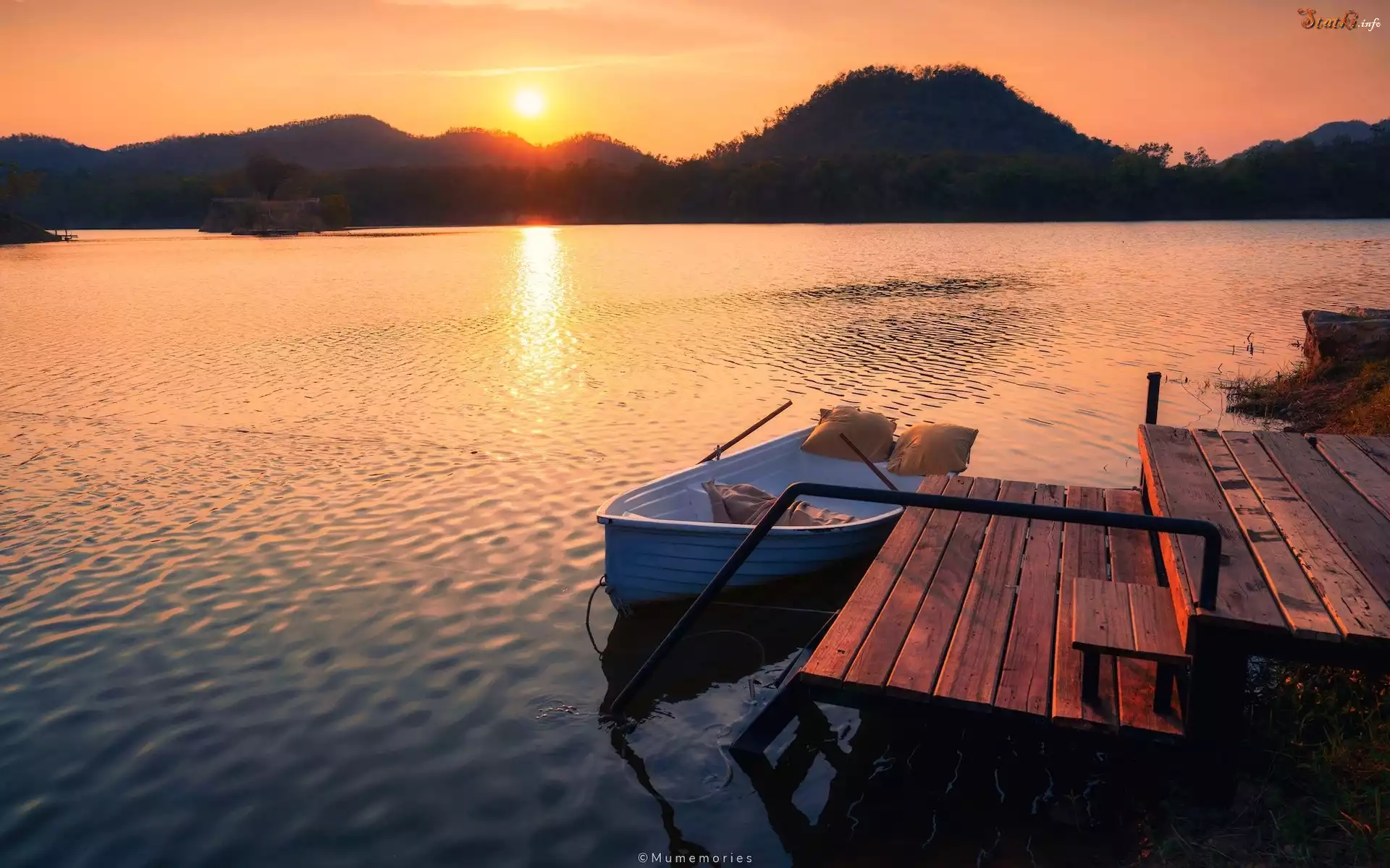 Statek Góry, Jezioro, Zachód słońca, Pomost, Łódka