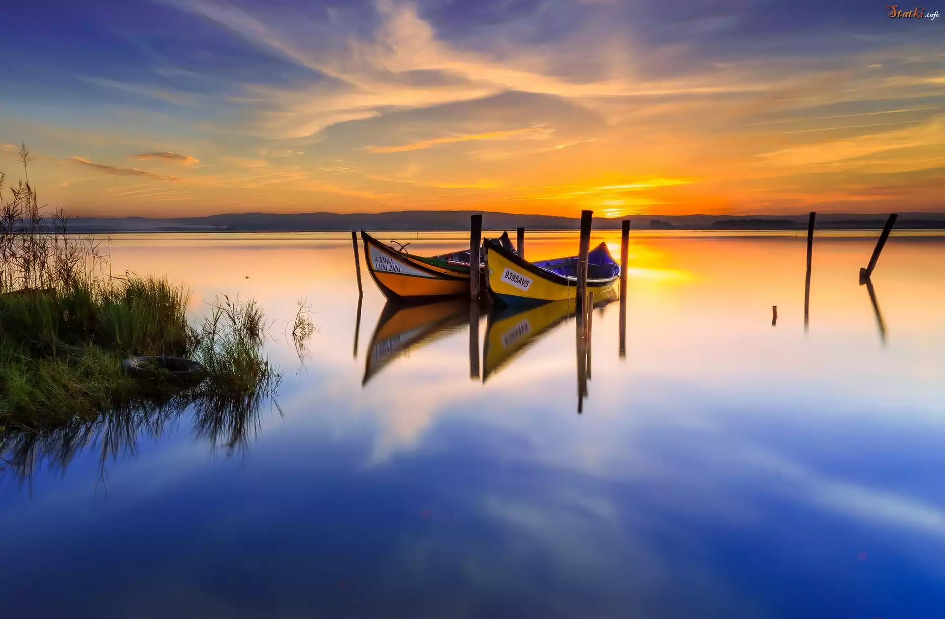 Statek Portugalia, Murtosa, Jezioro, Laguna Ria de Aveiro, Łodzie, Zachód słońca