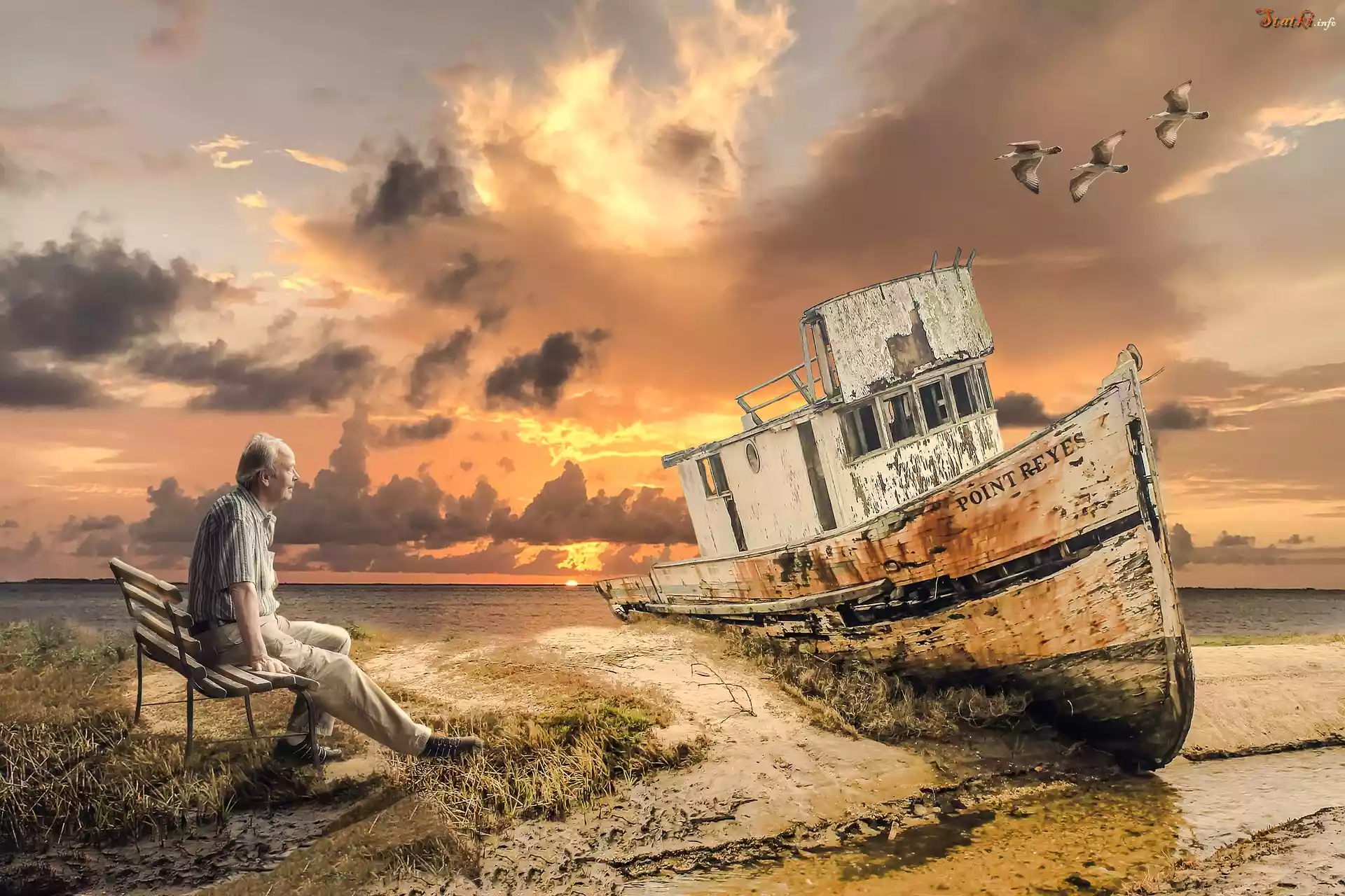 Statek Stary, Mężczyzna, Ławeczka, Morze, Stary, Statek, Wrak, Ptaki, Zachód Słońca