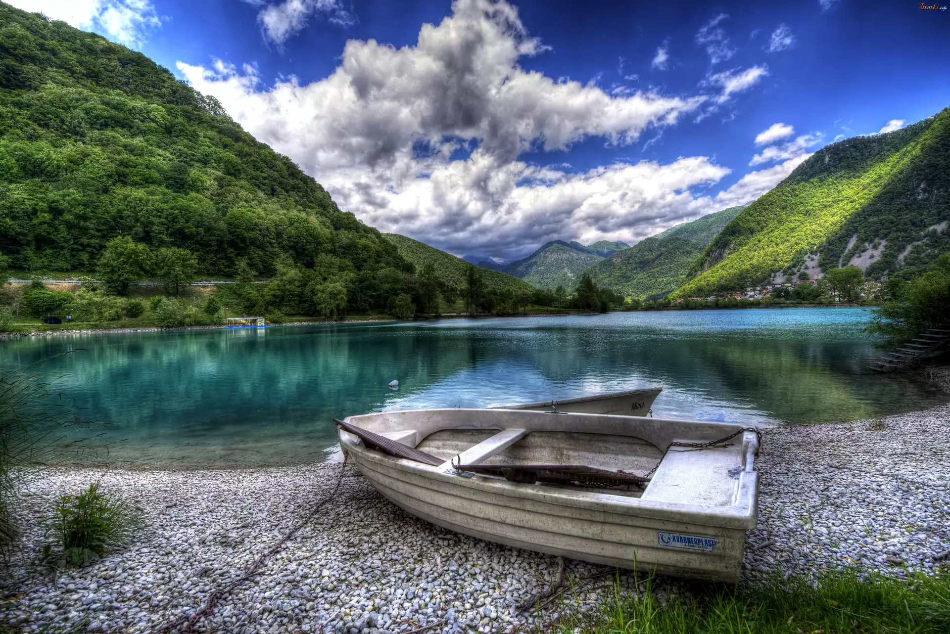 Statek Słowenia ,Góry, Jezioro, Drzewa, Brzeg, Łódka