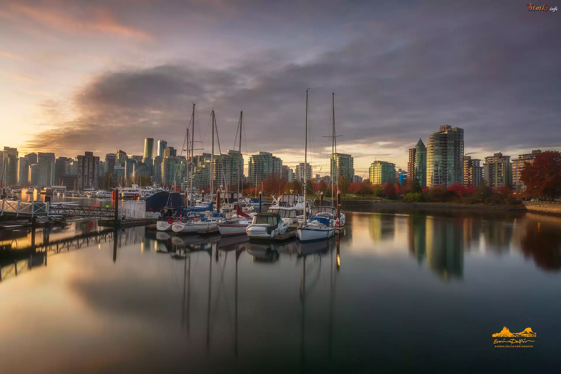 Stanley Park Marina, Przystań, Klub jachtowy, Żaglówki, Jachty, Wieżowce, Wschód słońca, Chmury, Jesień, Vancouver, Prowincja Kolumbia Brytyjska, Kanada |