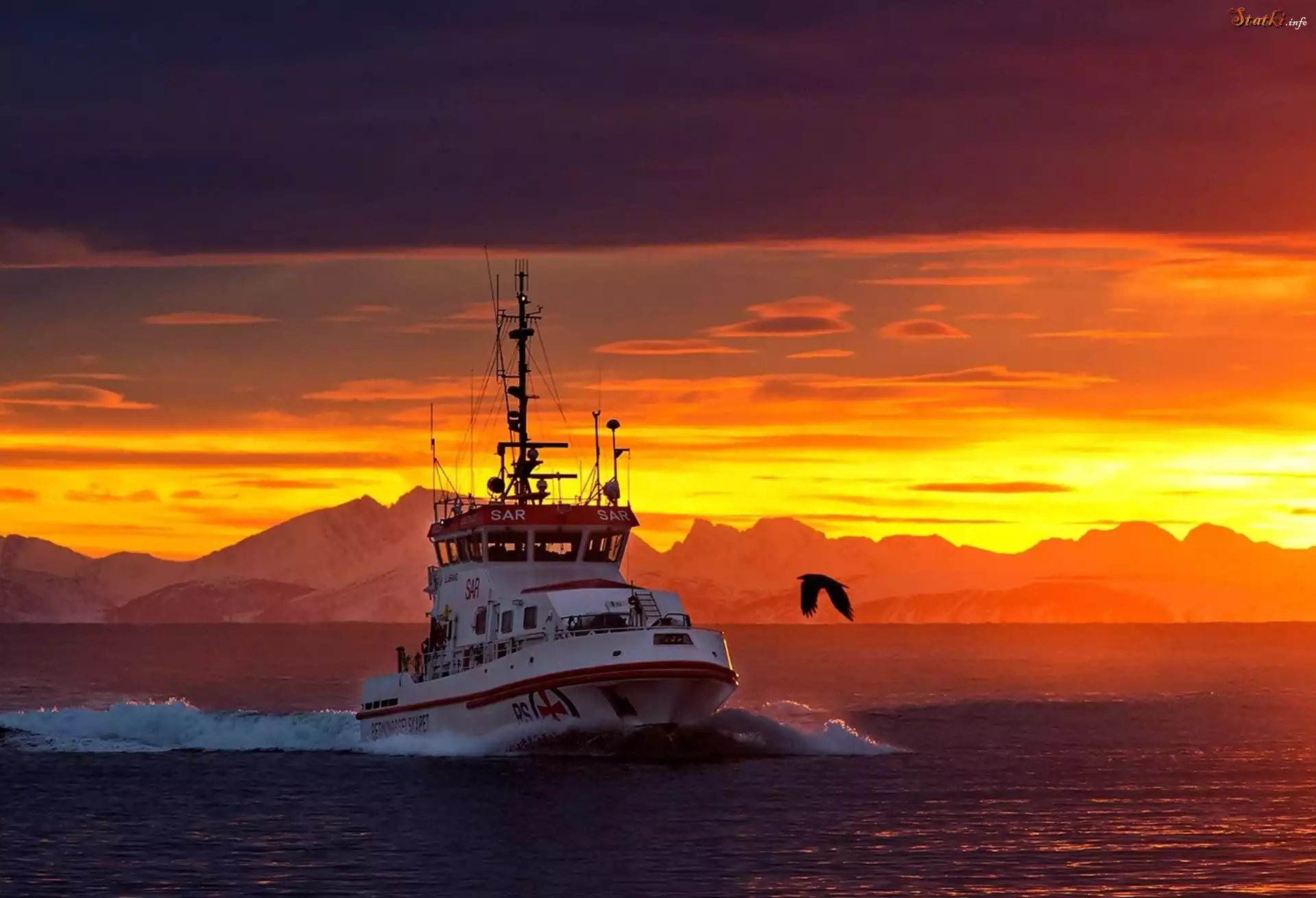 Statek Statek, Zachód, Słońca, Morze, Ptak