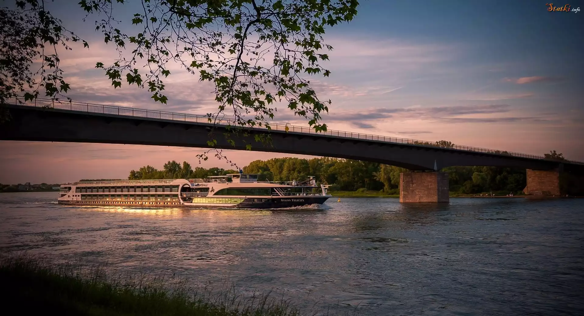 Statek Rzeka, Statek, Most, Wschód, Słońca, Gałęzie, Drzewa