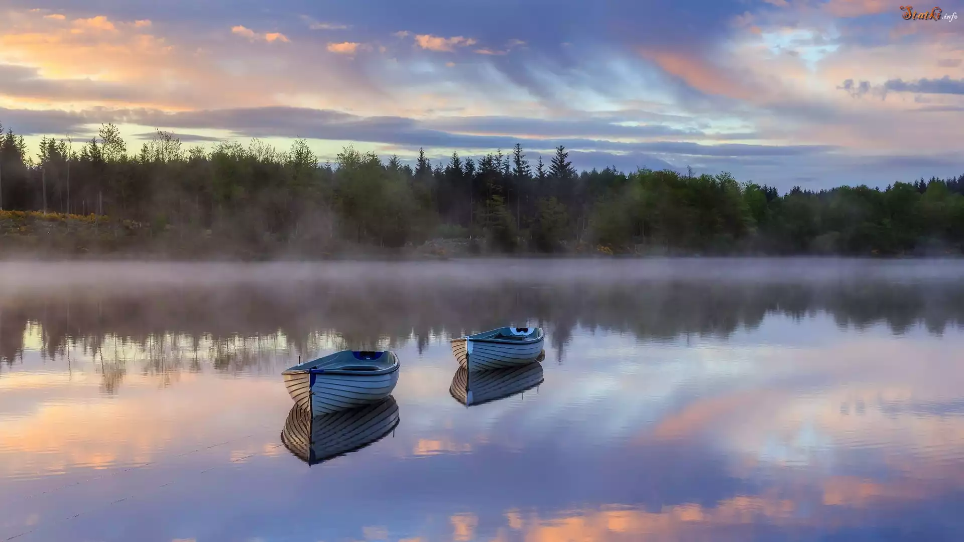 Statek Szkocja, Hrabstwo Perthshire, Jezioro Loch Rusky, Dwie, Łódki, Las, Drzewa, Mgła, Wschód słońca