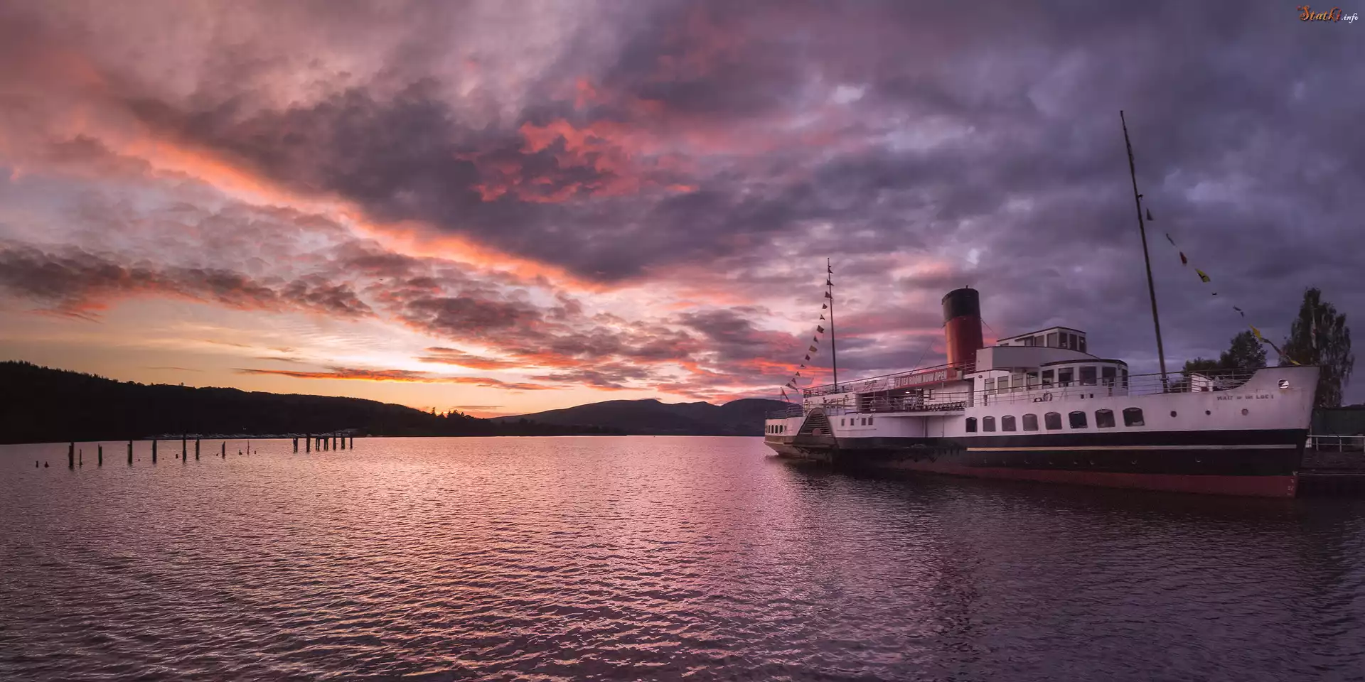 Szkocja, Park Narodowy Loch Lomond and the Trossachs, Jezioro Loch Lomond, Zachód słońca, Statek, Parowiec PS Maid of the Loch |