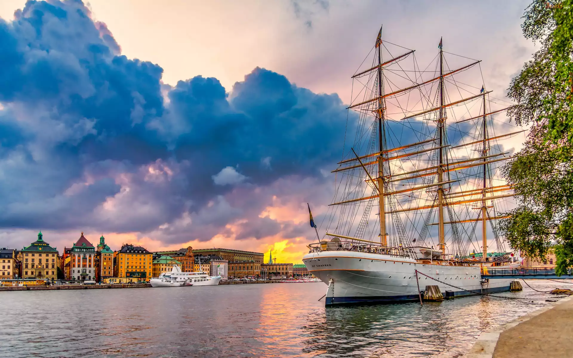 Statek Szwecja, Sztokholm, Zatoka Saltsjon, Domy, Żaglowiec, Chmury