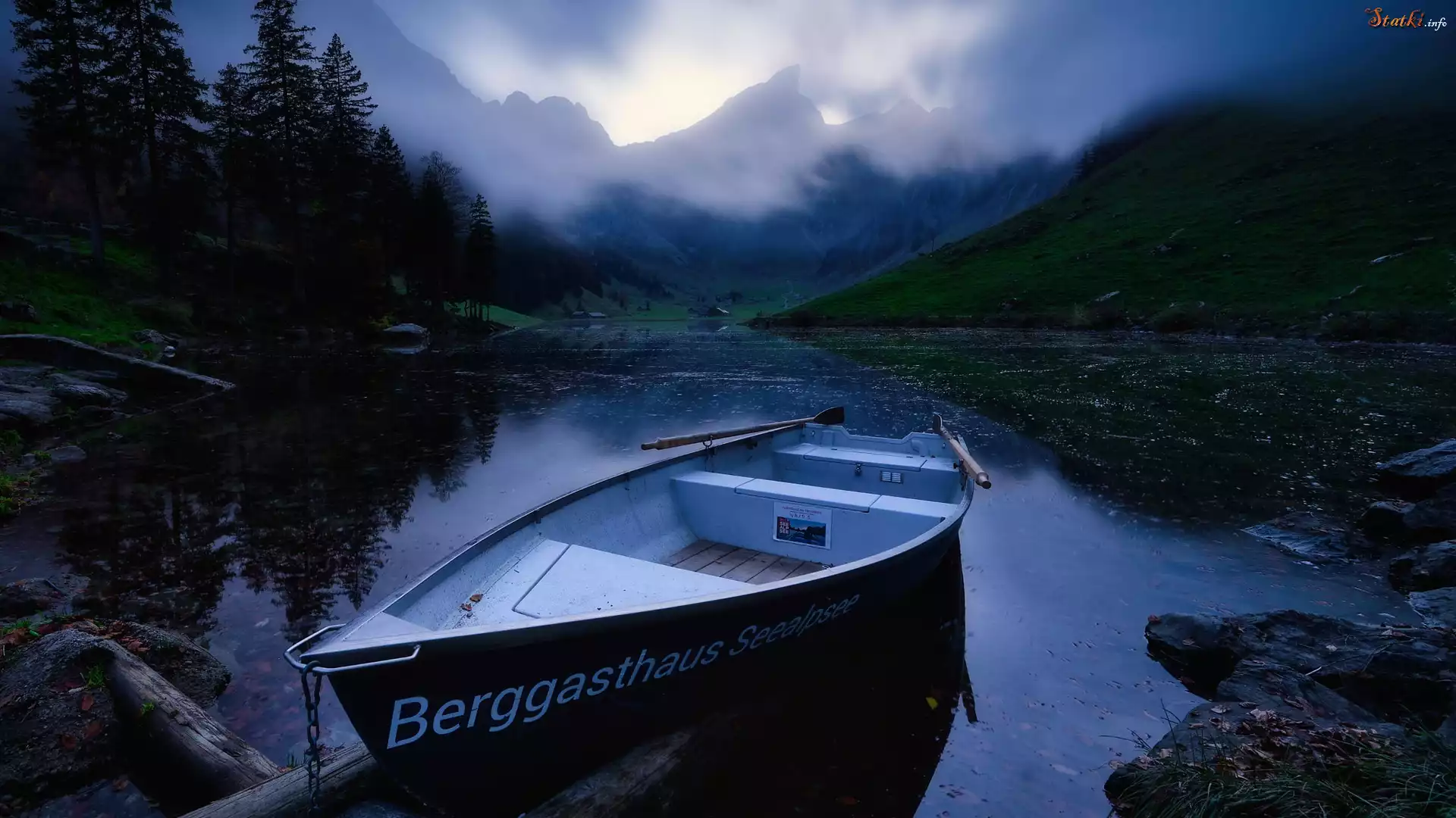 Góry, Jezioro, Seealpsee, Łódka, Mgła, Skały, Drzewa, Szwajcaria