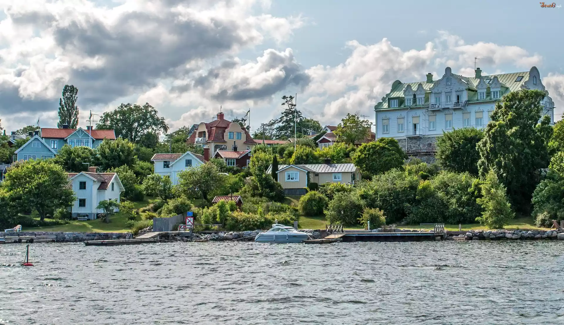 Statek Szwecja, Sztokholm, Rzeka, Drzewa, Domy