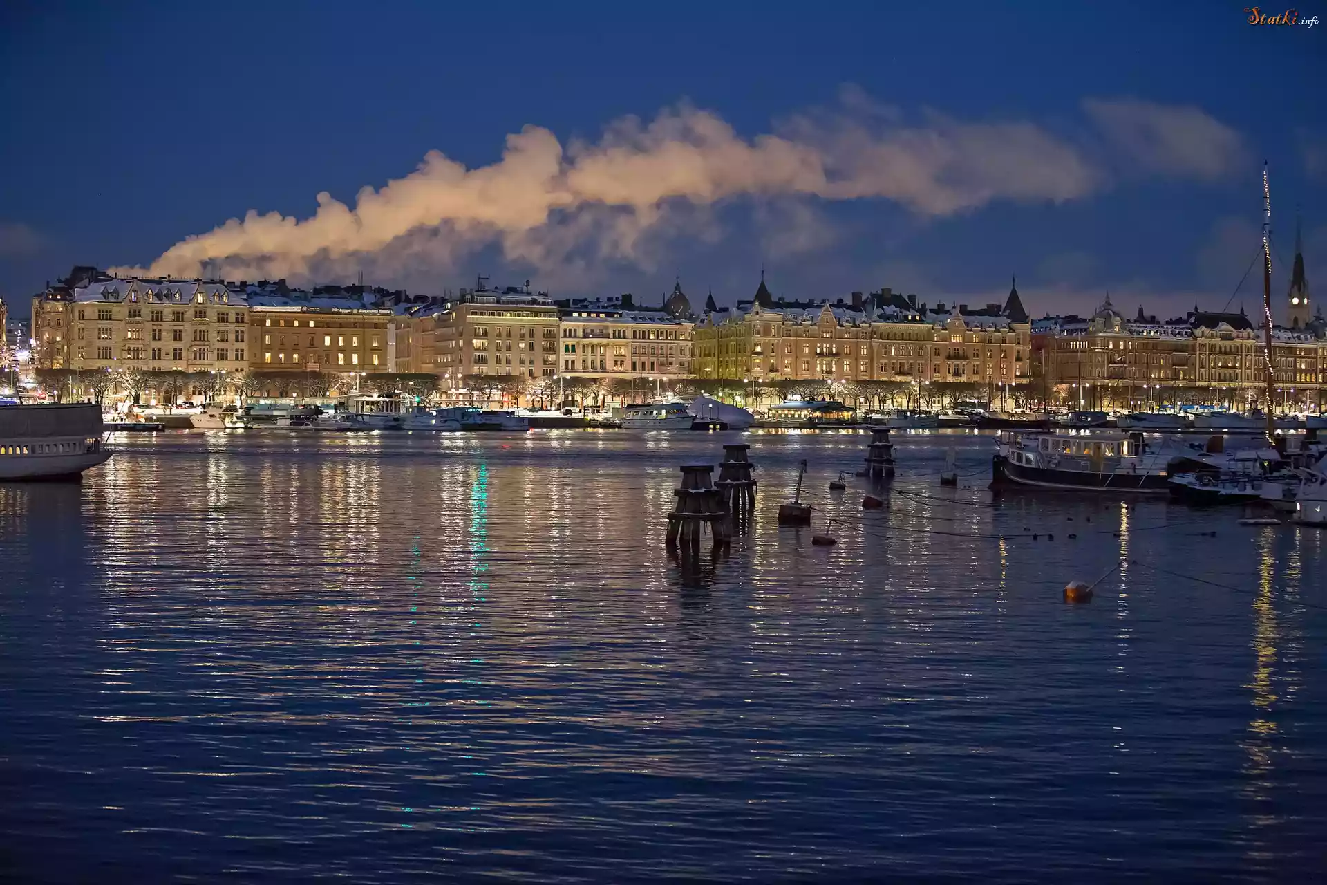 Szwecja, Sztokholm, Miasto, Noc, Morze, Łodzie
