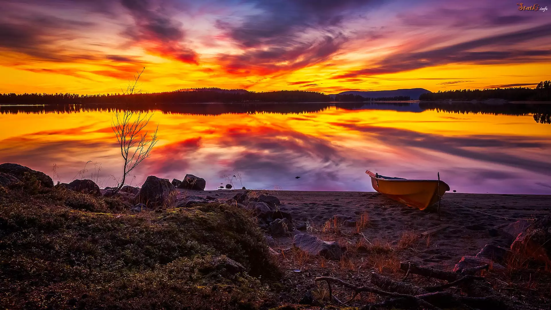 Szwecja, Arjeplog, Zachód słońca, Rzeka, Łódka