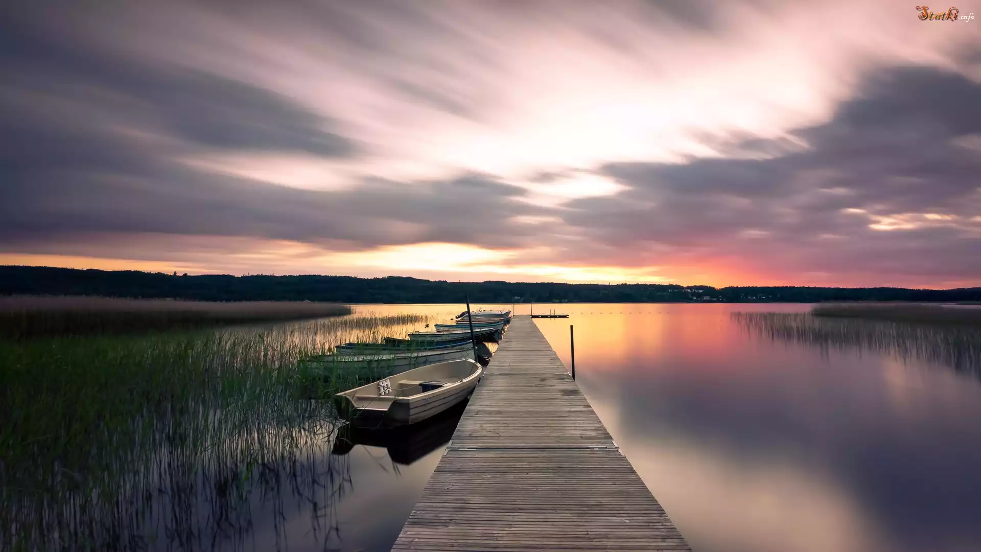 Statek Jezioro, Oresjo, Pomost, Łódki, Szuwary, Zachód słońca, Vastra Gotaland, Szwecja
