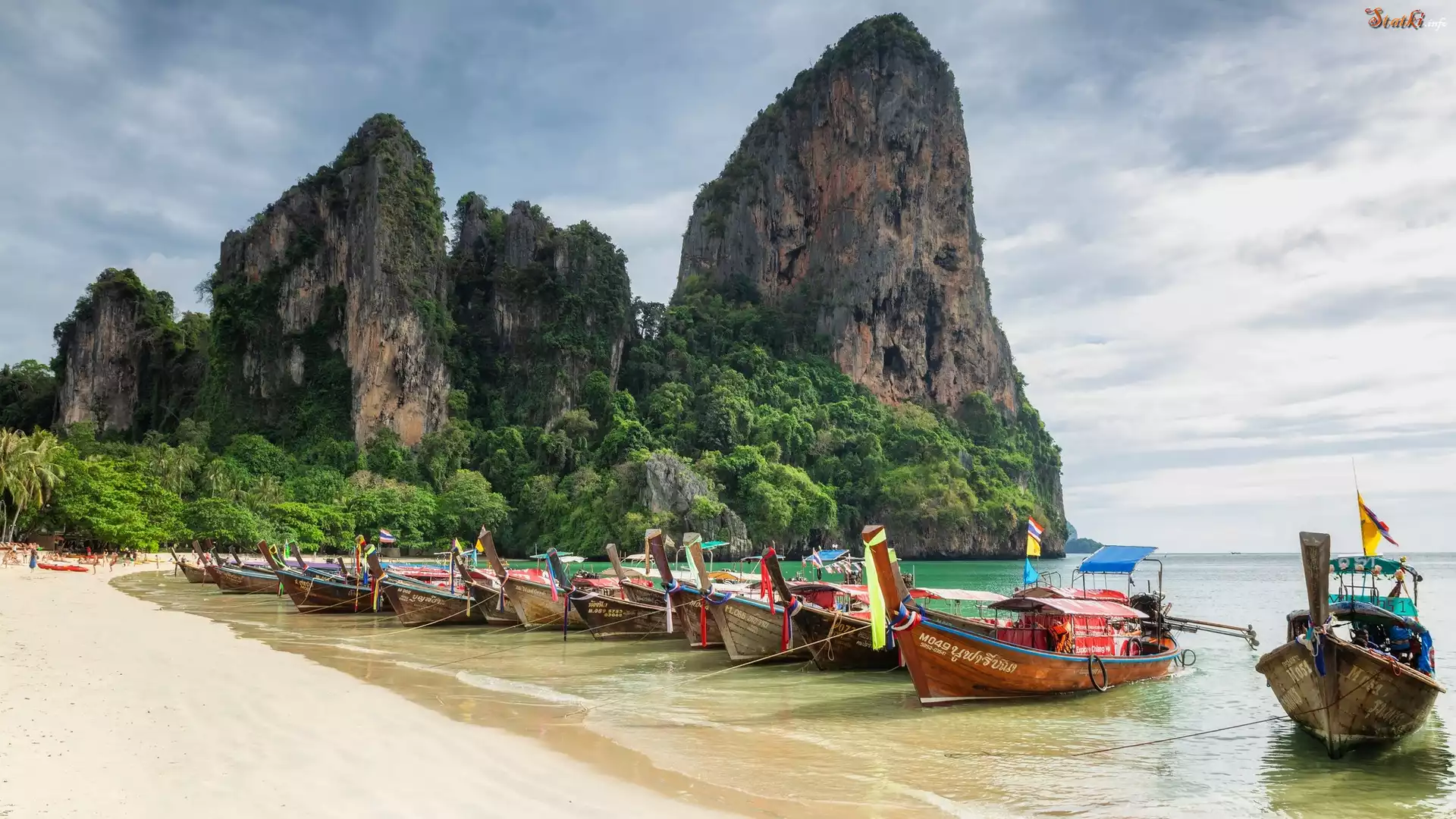 Statek Morze, Plaża, Railay Beach, Skała, Łodzie, Drzewa, Tajlandia