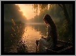 Kobieta, Łódka, Jezioro, Trawa, Zachód słońca, Grafika