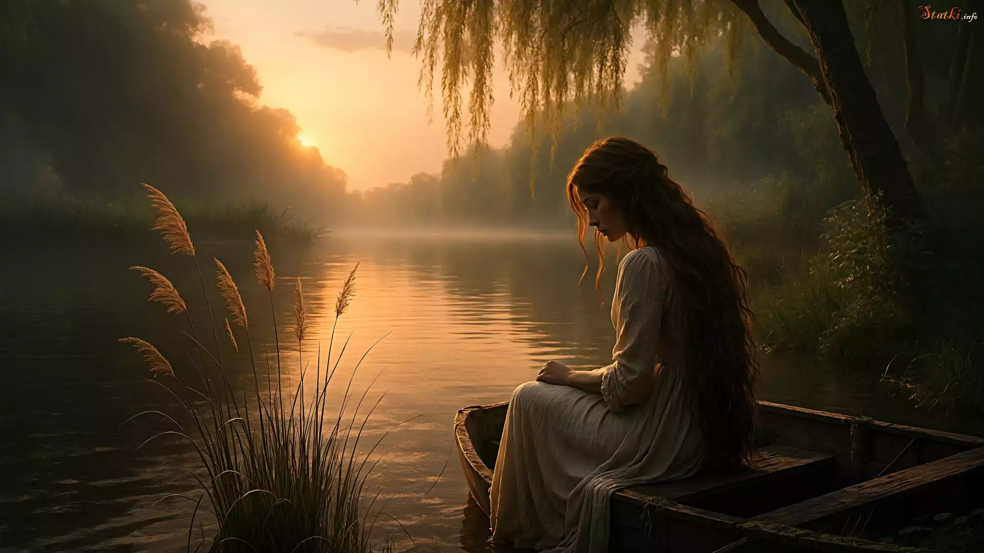 Statek Kobieta, Łódka, Jezioro, Trawa, Zachód słońca, Grafika