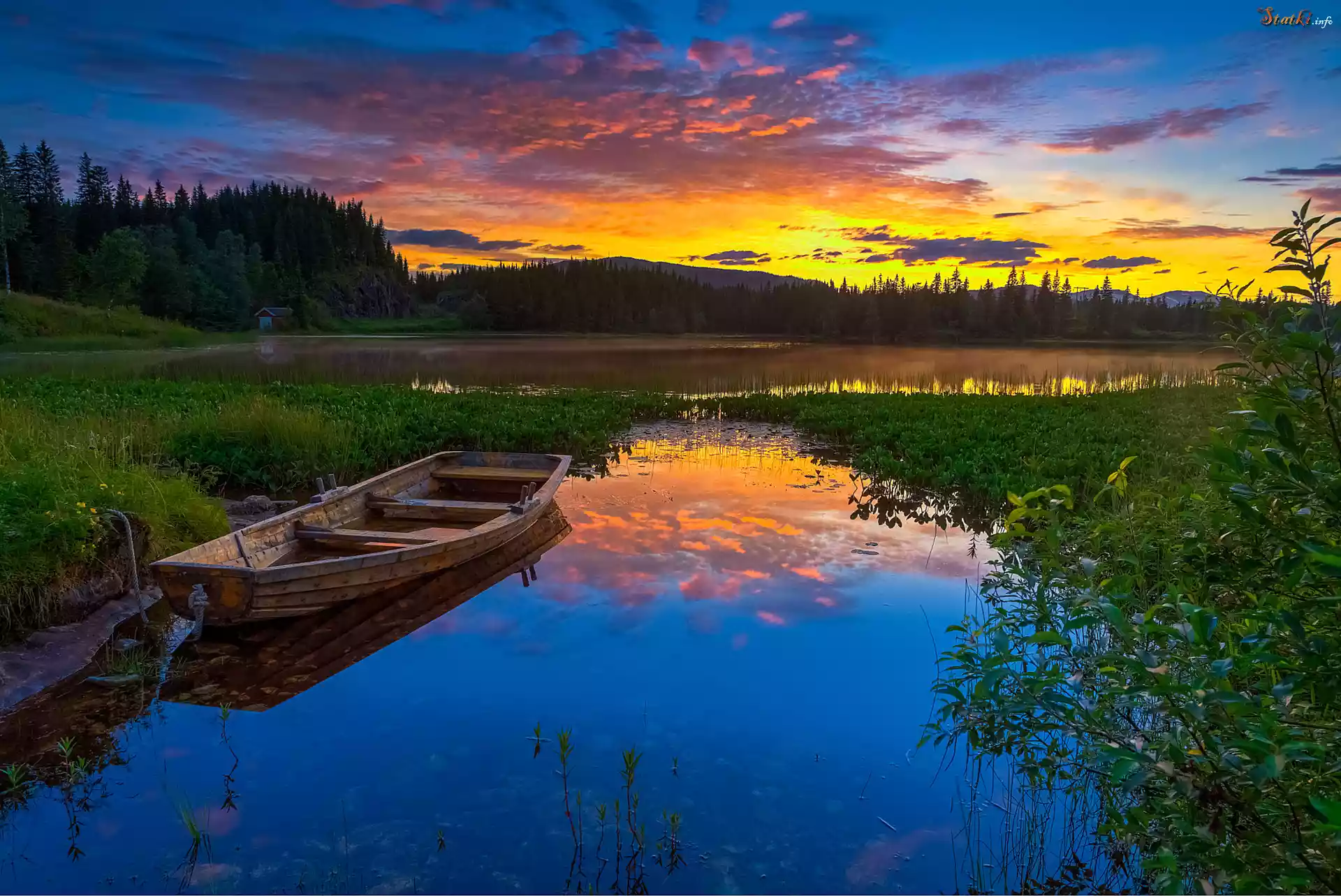 Łódka, Jezioro, Zachód, Słońca, Odbicie, Chmury, Drzewa, Trawa