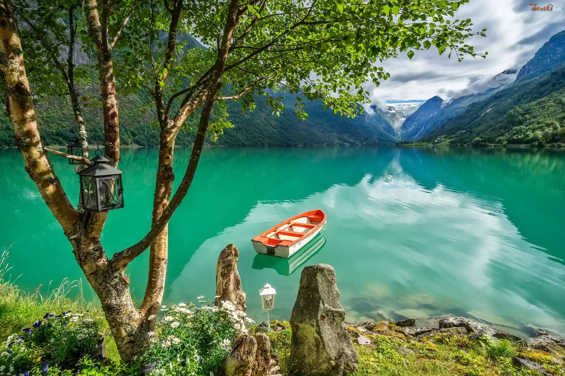 Jezioro Briksdalsbrevatnet, Łódka, Góry, Lasy, Drzewo, Lampiony, Kamienie, Okręg Vestland, Norwegia