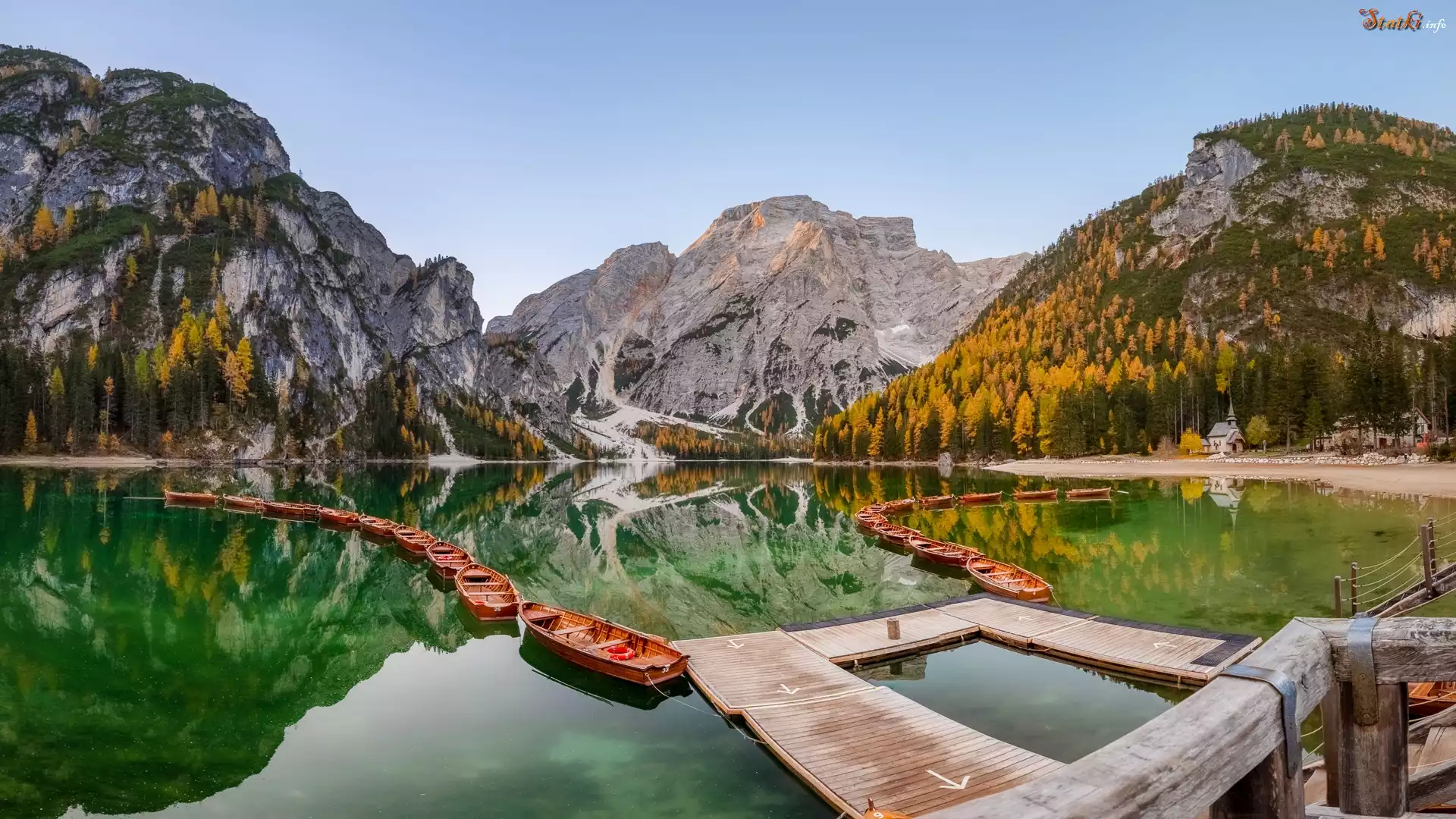 Statek Włochy, Jezioro, Pragser Wildsee, Lago di Braies, Góry, Dolomity, Łódki, Drzewa, Jesień, Odbicie