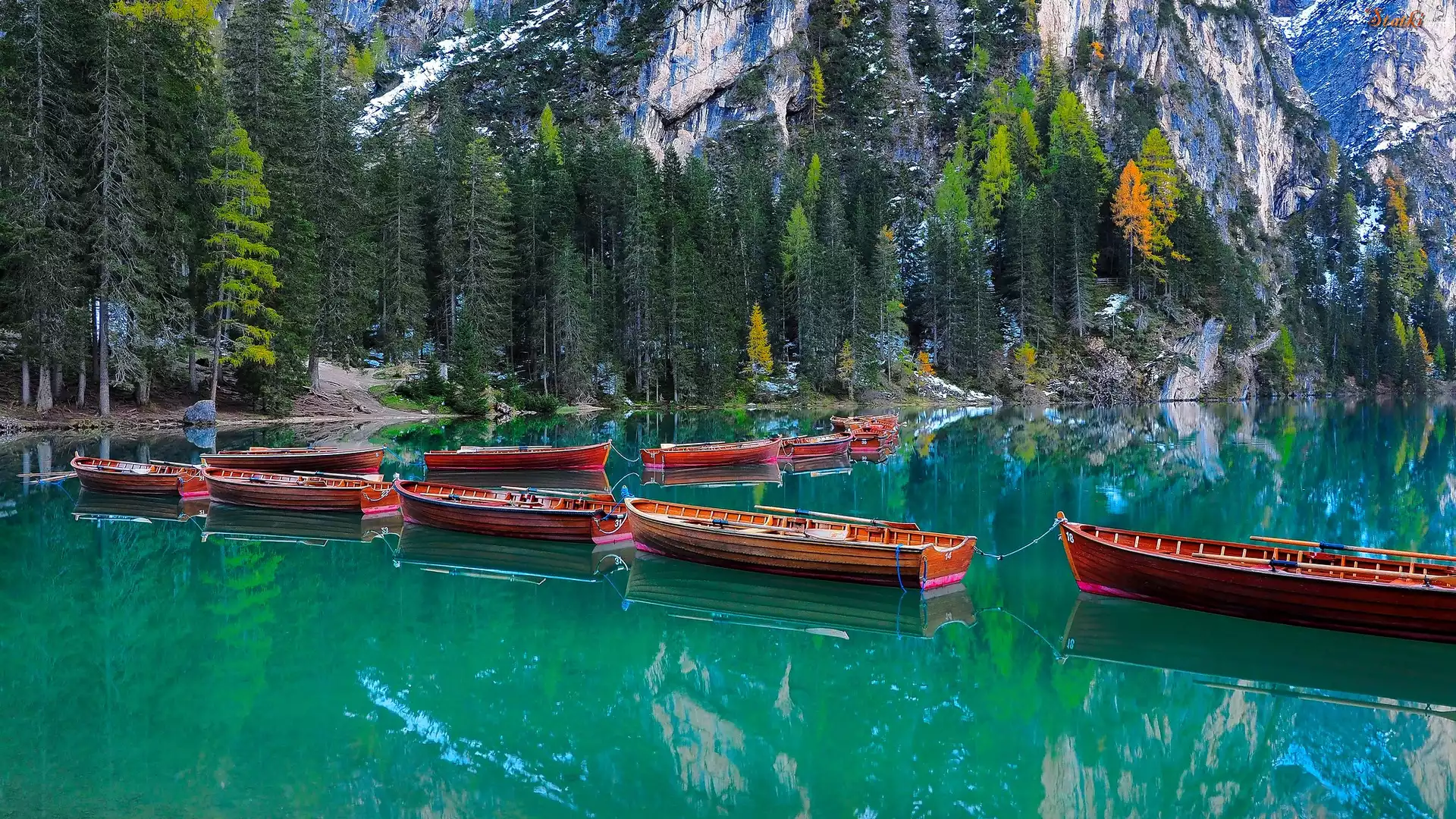 Statek Włochy, Jezioro, Pragser Wildsee, Skały, Drzewa, Łodzie