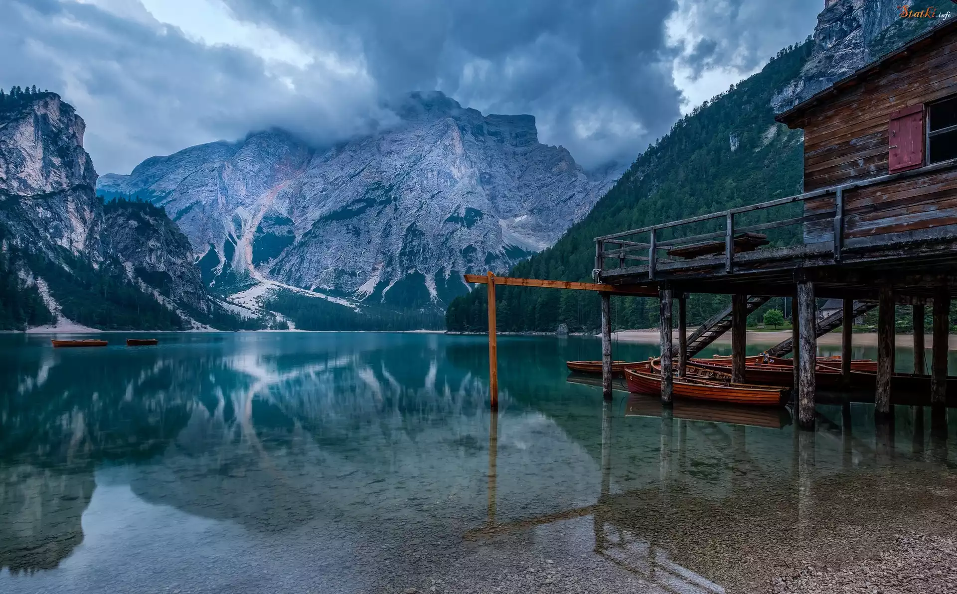 Statek Włochy, Południowy Tyrol, Jezioro Pragser Wildsee, Góry Dolomity, Drewniany, Dom, Łódki, Drzewa