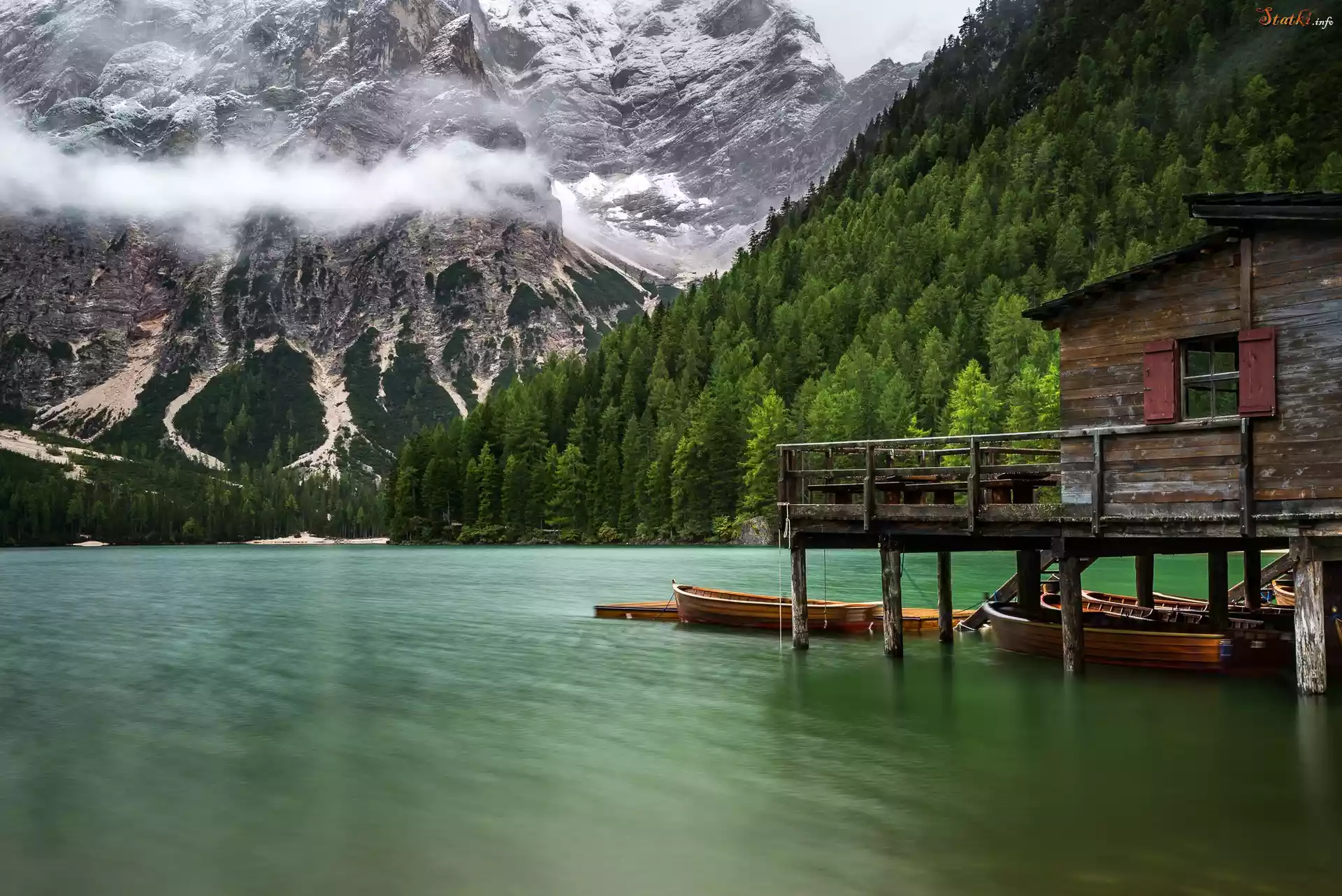 Statek Włochy, Południowy Tyrol, Jezioro Pragser Wildsee, Góry Dolomity, Drzewa, Drewniany, Dom, Łódki