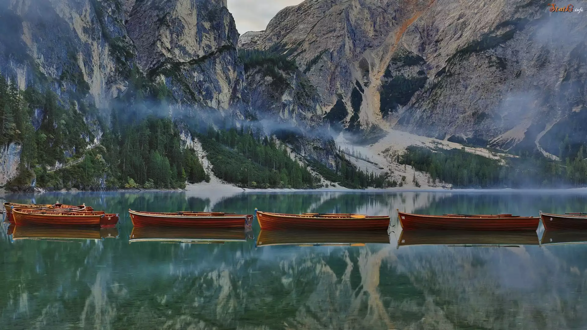 Statek Włochy, Jezioro Pragser Wildsee, Lago di Braies, Góry, Dolomity, Łódki